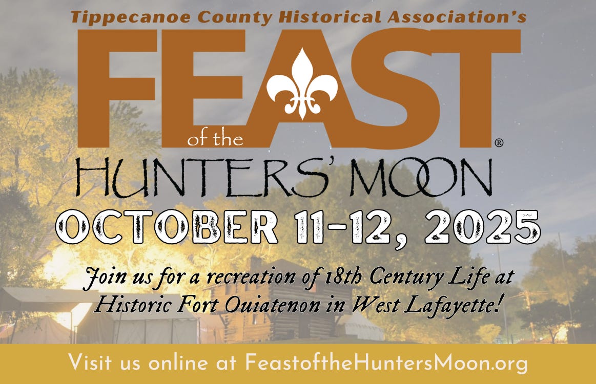 Support for this edition comes from the Tippecanoe County Historical Association, presenting the annual Feast of the Hunters’ Moon, Oct. 11-12 at Historic Fort Ouiatenon. Immerse yourself in 18th century life along the Wabash River, with delicious food, live music, educational demonstrations and fun activities for all ages. Day passes, weekend passes and family passes are on sale now at feastofthehuntersmoon.org.