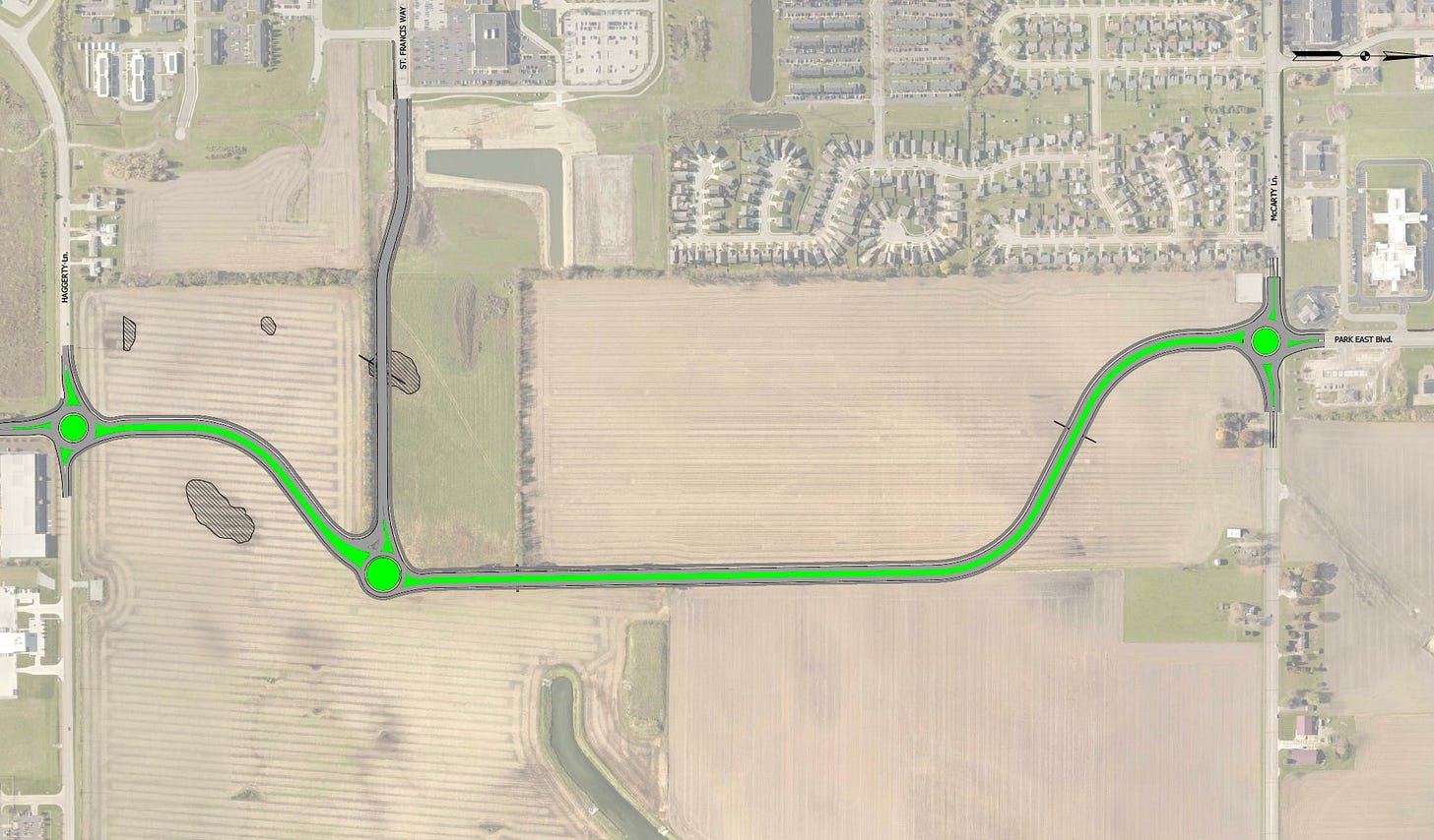 The road will connect South Street and Indiana 38, including roundabouts at Haggerty Lane, McCarty Lane and an extension of St. Francis Way, leading to Creasy Lane at Franciscan East Hospital.