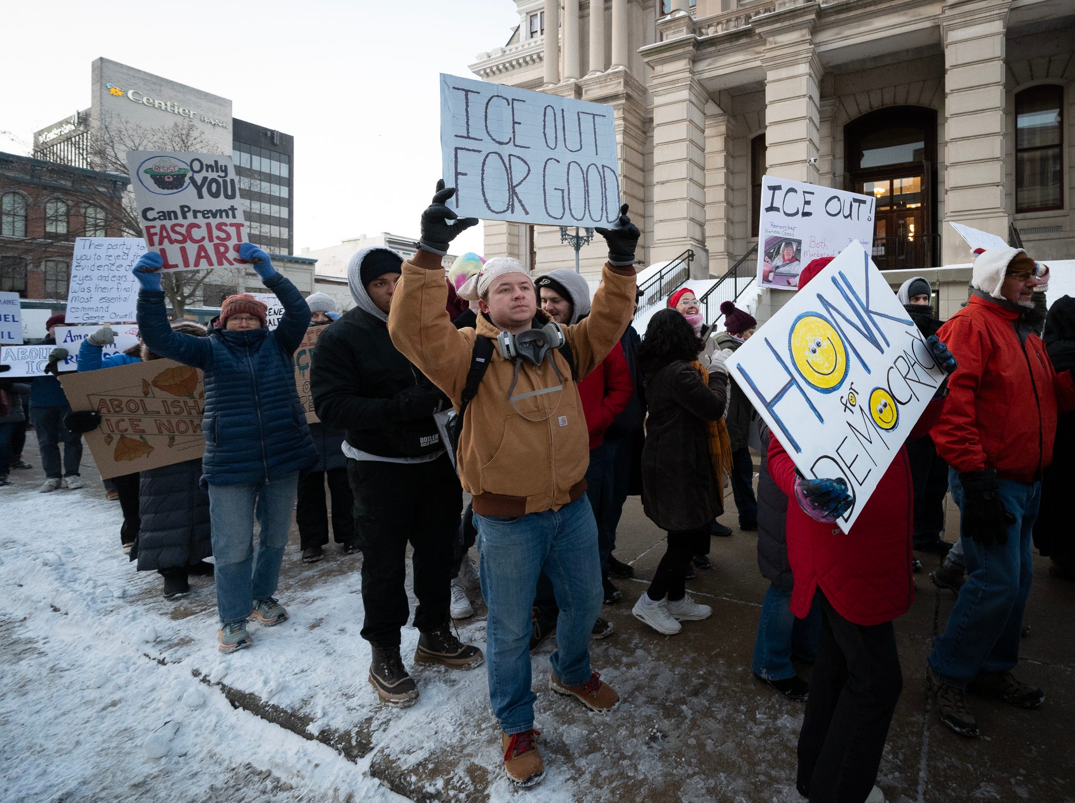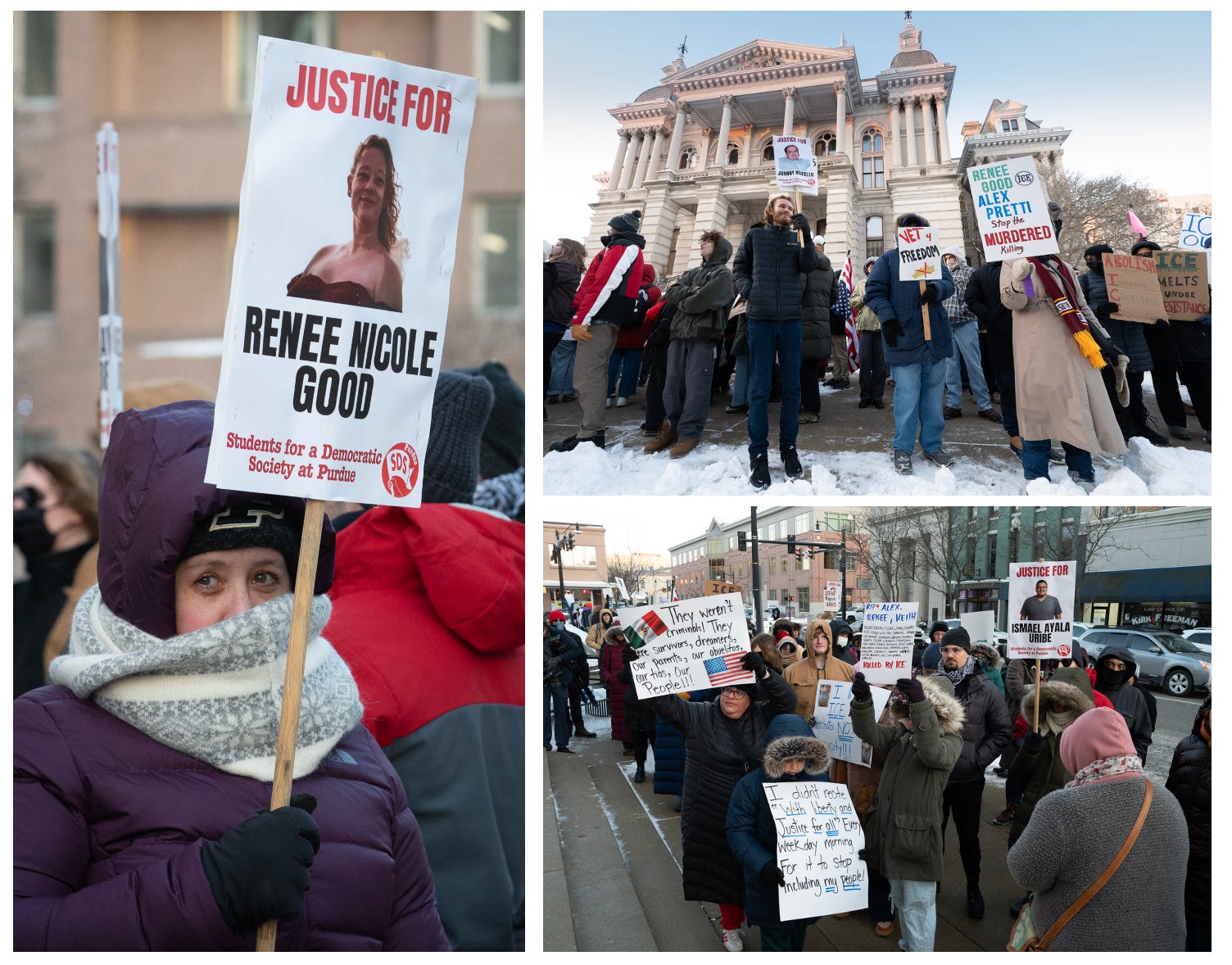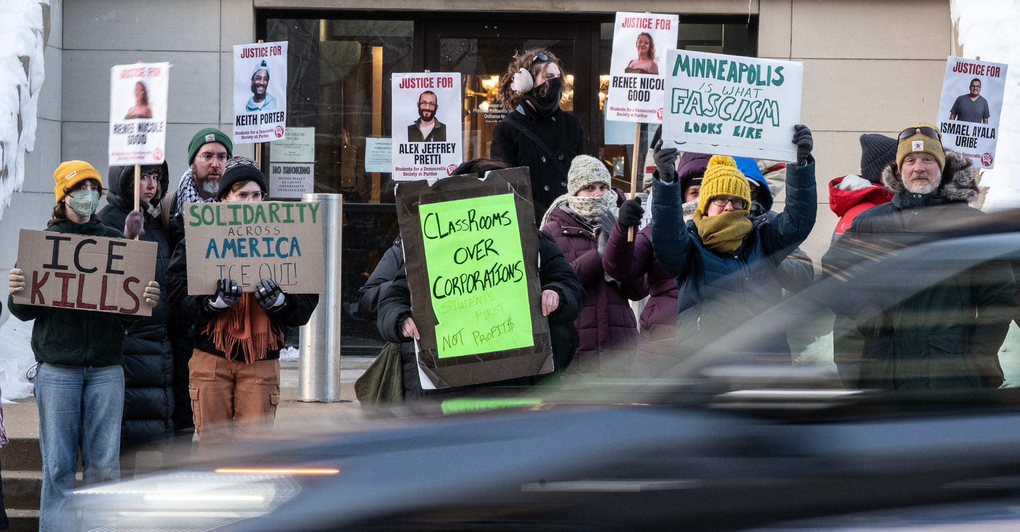 A couple of hundred people demonstrated outside the Tippecanoe County Courthouse in feels-like temperatures near zero degrees Tuesday evening, joining those in other communities protesting ongoing operations by Immigration and Customs Enforcement officers in Minneapolis and other cities.