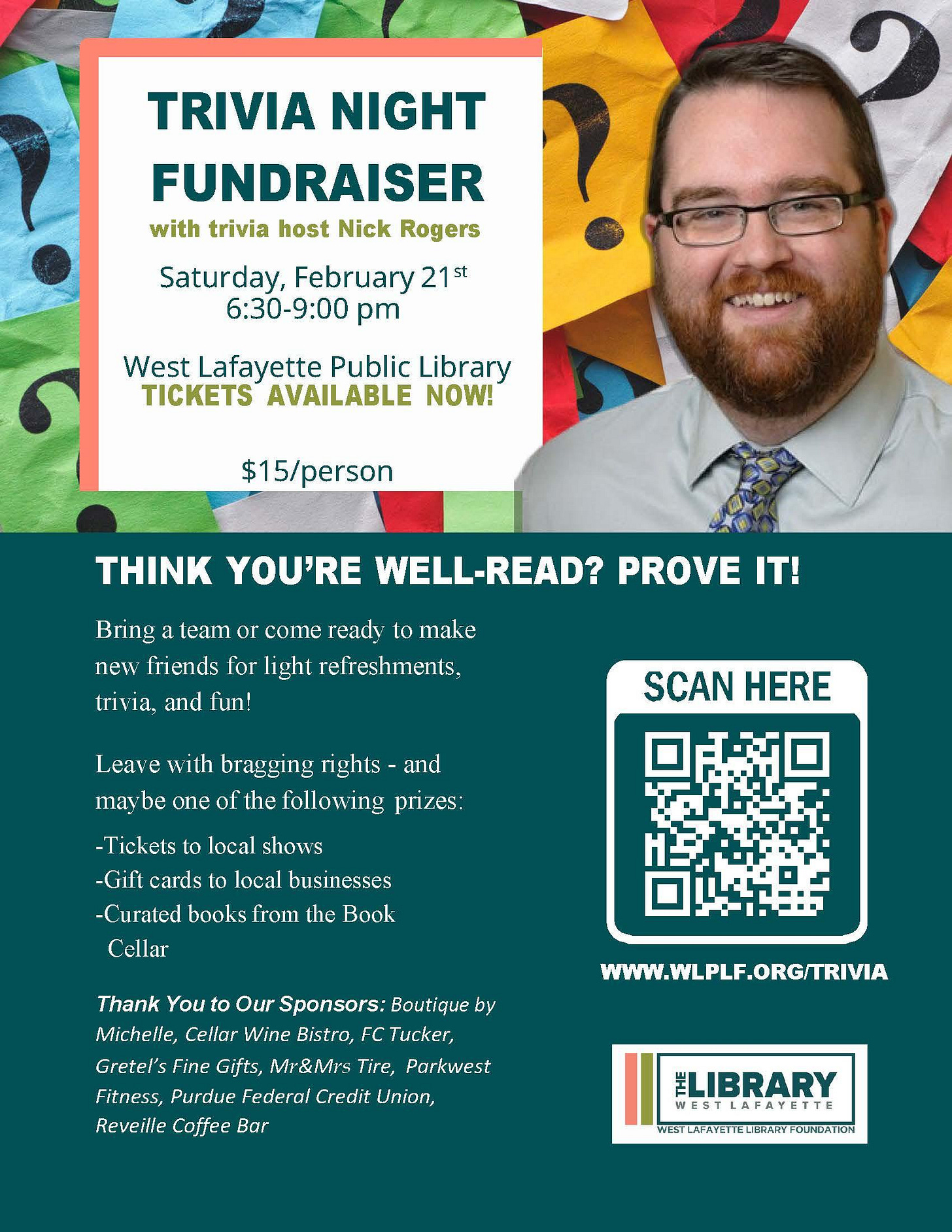 Support for this edition comes from the West Lafayette Public Library Foundation, which will host a Trivia Night Fundraiser Feb. 21 to support the library. Local trivia master Nick Rogers will preside at the all-ages event from 6:30-9 p.m. For tickets, $15 for individuals and $120 for a table of up to eight people, go to: www.wlplf.org/trivia