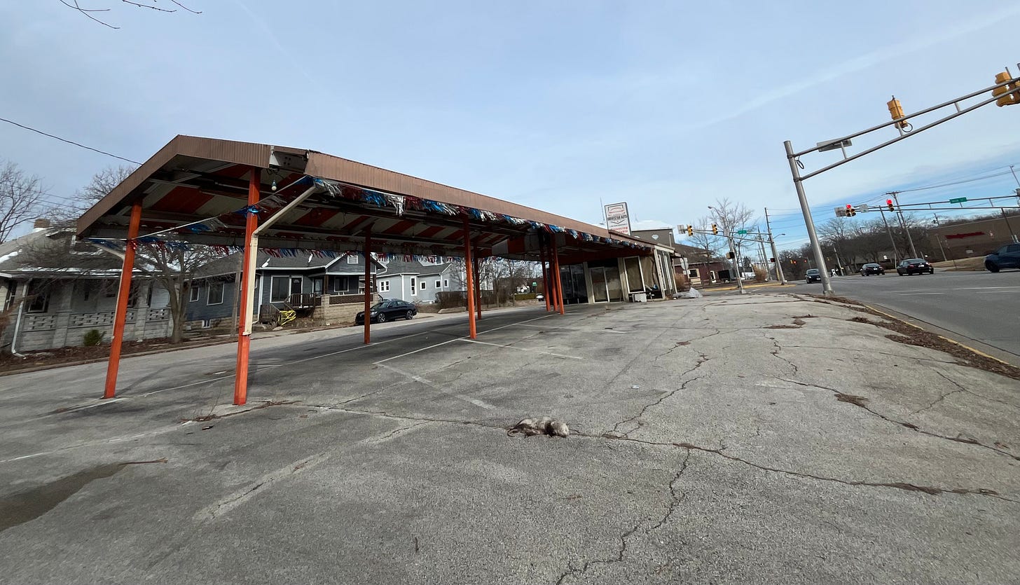 Pop’s B&K Root Beer Stand was a drive-in opened in 1948 by Bernard Finley. It was a staple at the corner through several owners before being converted into other restaurants and then assorted car sales and detailing businesses.