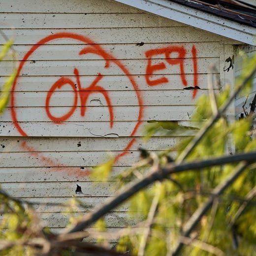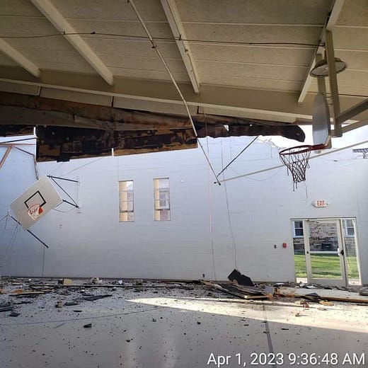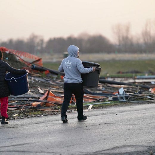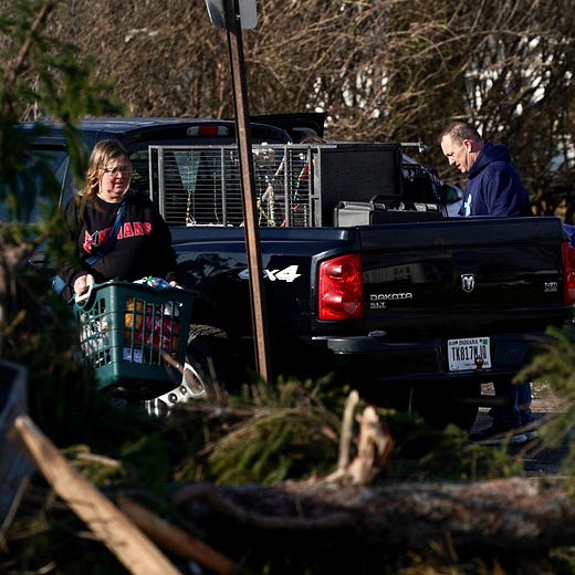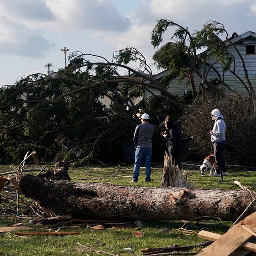 Near Colfax, about 20 miles south of Lafayette along U.S. 52, Kyle Hancock told Based in Lafayette correspondent Vincent Walter that he and his wife, Michelle, gathered their kids and hunkered down after hearing sirens from the town. Saturday morning, they were going through trees strewn in their yard and a missing roof from the winds.