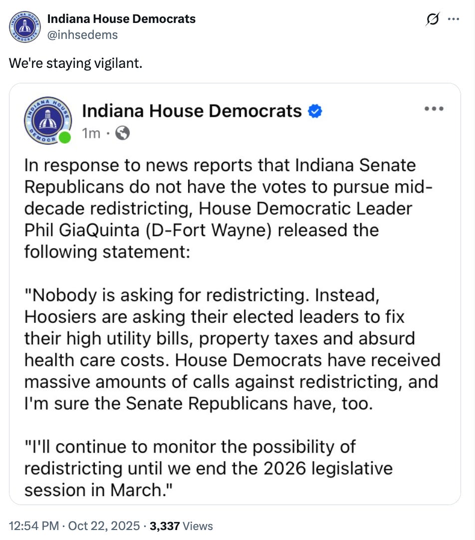For the full report, here’s the way in: “Indiana Republicans don’t have votes to back Trump’s redistricting, Senate leader spox says. The news comes just days after President Donald Trump held a phone call with reluctant members.”