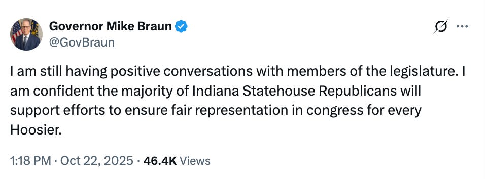 Gov. Mike Braun, who would be in a position to call a General Assembly special session, was still rooting for redistricting, posting this Wednesday afternoon: “I am still having positive conversations with members of the legislature. I am confident the majority of Indiana Statehouse Republicans will support efforts to ensure fair representation in Congress for every Hoosier.”