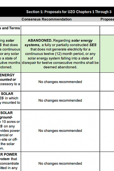 Here are PDFs breaking down the recommendations for definitions and permitted uses; zoning guidelines for solar energy systems; and the decommissioning process.