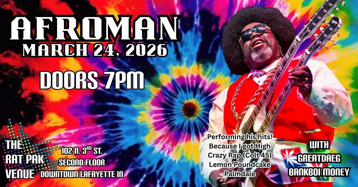 Thanks, again, for support for this edition from Rat Pak Venue in downtown Lafayette, presenting Afroman at 9 p.m. Tuesday, March 24. Get tickets here.