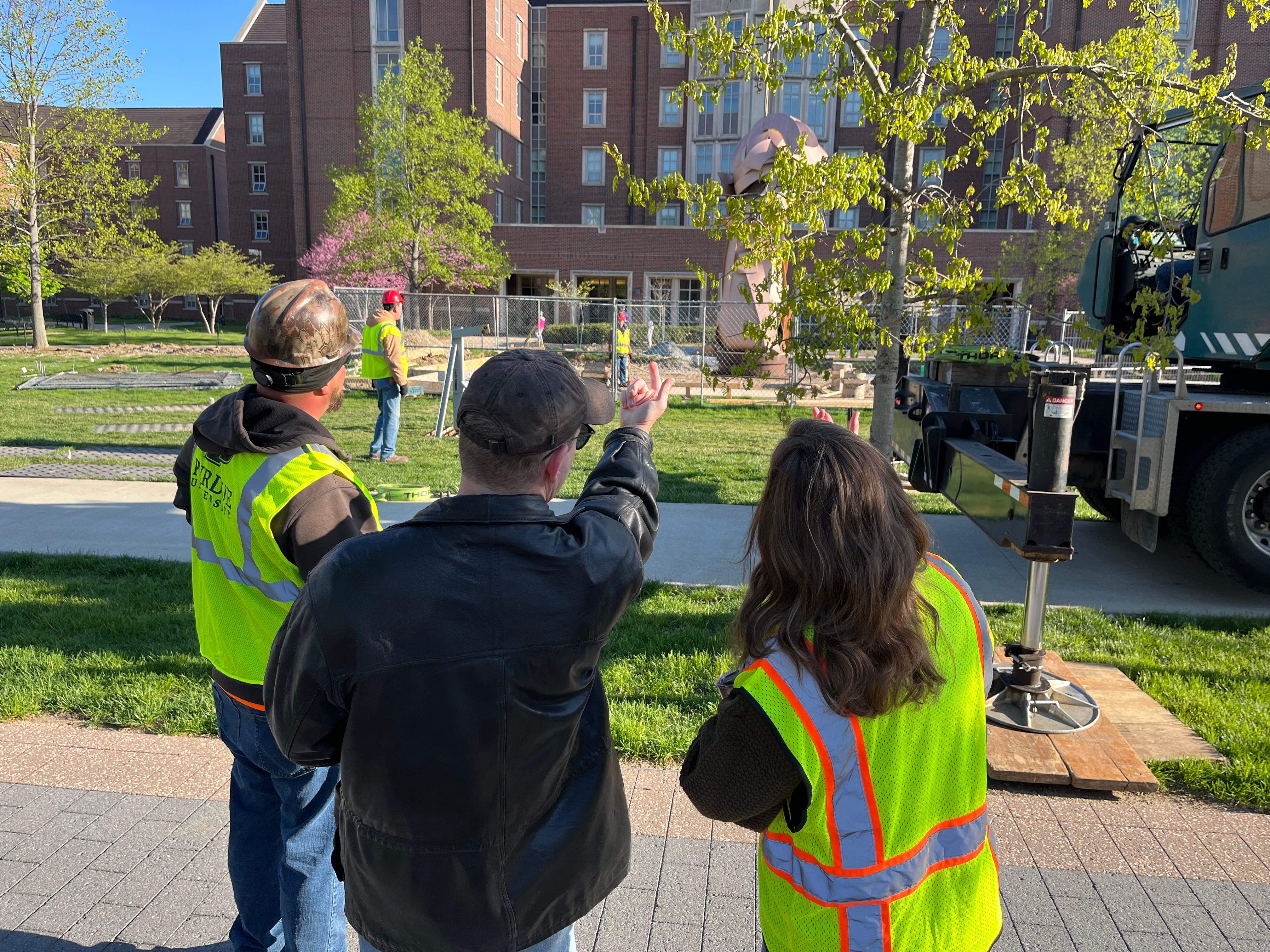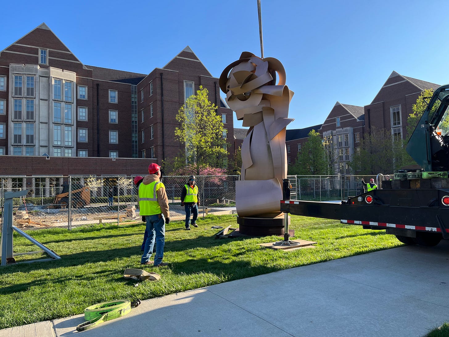 As Purdue was starting to rack up the first tens of millions of dollars in its Day of Giving Wednesday morning, Arne Flaten was giving crews with a crane hand signals – a little more this way/a little more that way-style – as the university’s latest, large-scale sculpture was lowered and rotated into place outside First Street Suites residence halls.
