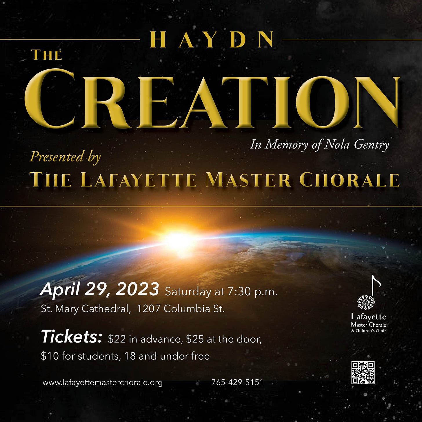 Thanks for sponsorship help today from The Lafayette Master Chorale, presenting Joseph Haydn's "The Creation," 7:30 p.m. Saturday, April 29, at St. Mary Cathedral, 1207 Columbia St., Lafayette. Join us for the 225th anniversary of Haydn’s epic choral masterpiece depicting the creation of the world. Performed here last in 2000, this work is distinctly programmatic, with chorus and symphony reflecting one of the most enduring stories ever written. Tickets at lafayettemasterchorale.org.