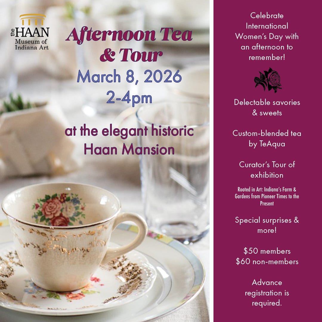 Support for this edition comes from the Haan Museum of Indiana Art, presenting its Afternoon Tea & Tour to celebrate International Women’s Day on Sunday, March 8, at the Haan Mansion, 920 State St. in Lafayette. For tickets, go to: thehaan.org/event/afternoon-tea-tour/
