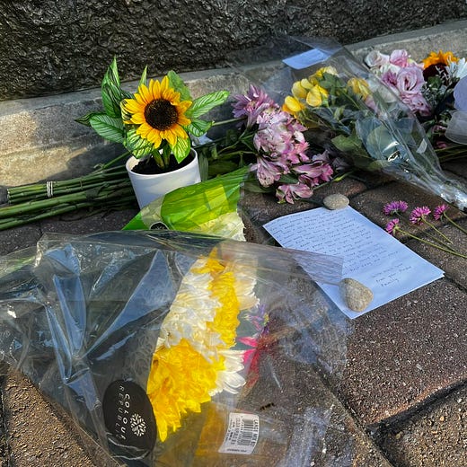 Joining a slow surge of students taking that invitation, Purdue junior Sarah Smith delivered a flower to a growing memorial at the base and gave a pat to a sticky note she said read, “No more.”