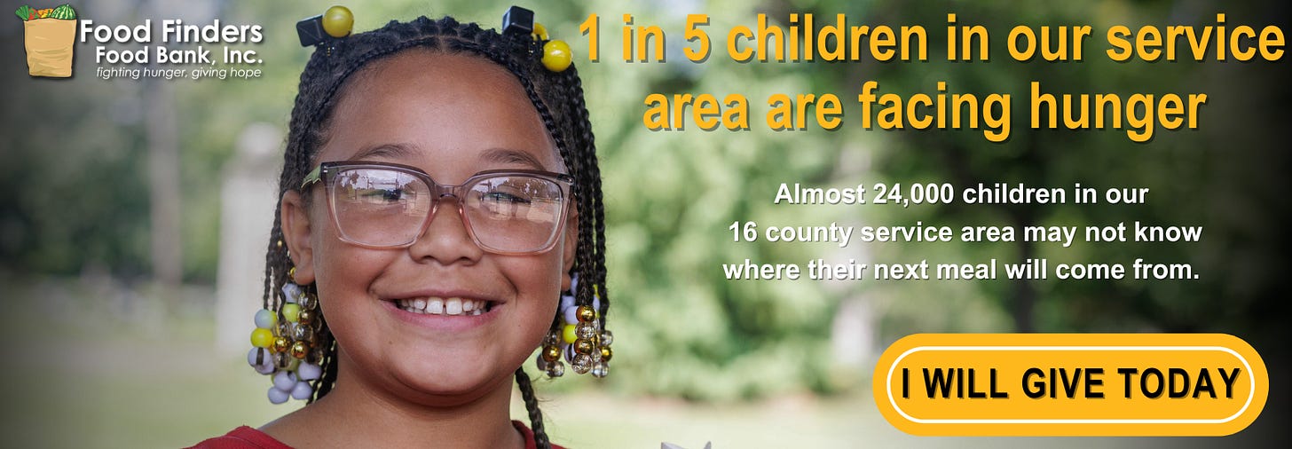 Support for this edition comes from Food Finders Food Bank. Since 1981, Food Finders has been a critical component in providing food to those in need and advocating to end food insecurity. In our 16-county service area, one in seven people face hunger. And the risk of hunger is more likely to affect households with children. Here’s how you can help Food Finders meet this mission.