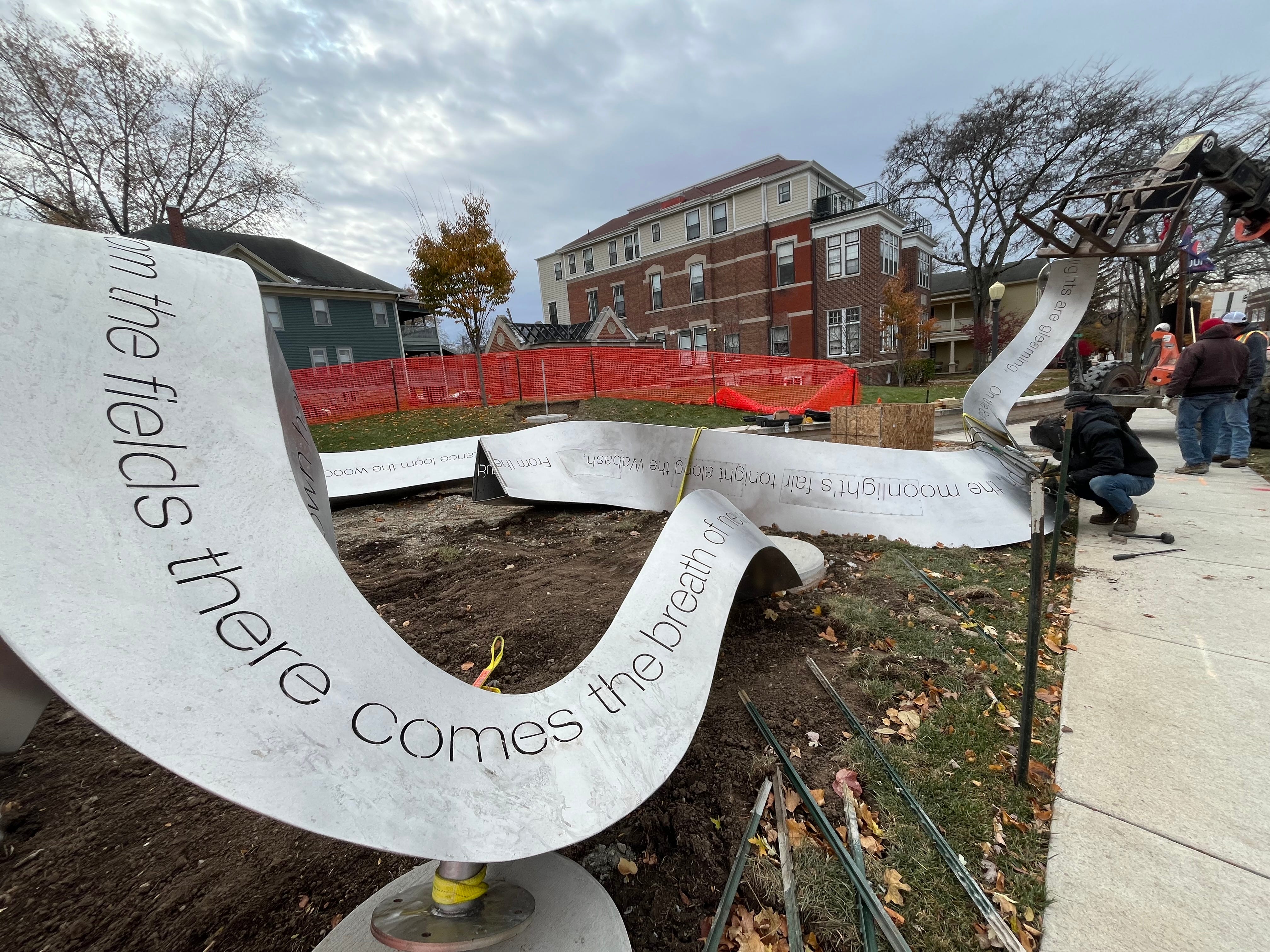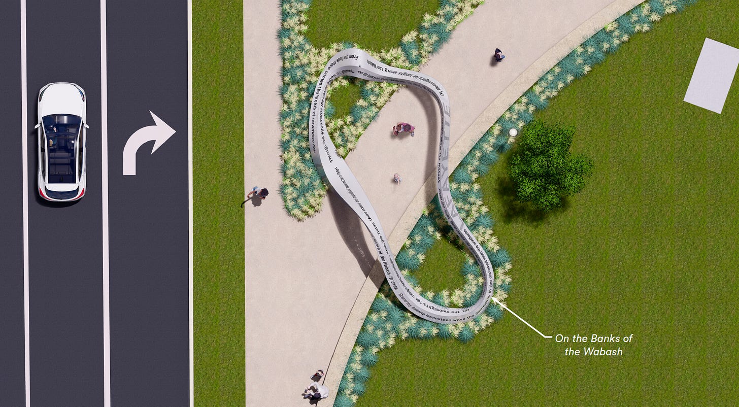 The sculpture features excerpts from the first verse and chorus of “On the Banks of the Wabash, Far Away” by Indiana native Paul Dresser and the state of Indiana, laser etched into the piece.