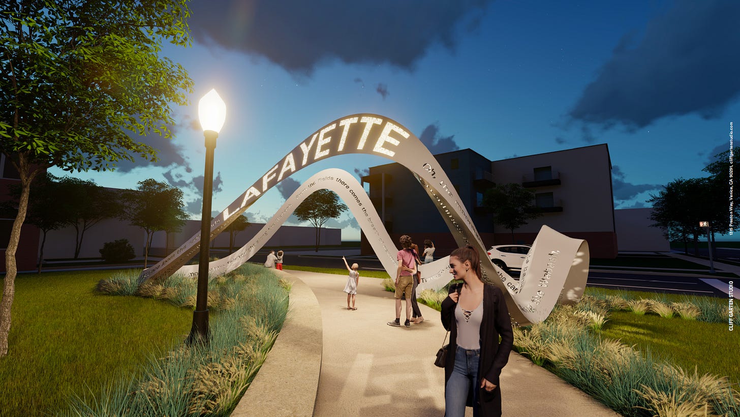 The word “Lafayette” was cut into the pinnacle of the sculpture’s arches, illuminated like a glowing lightbox.