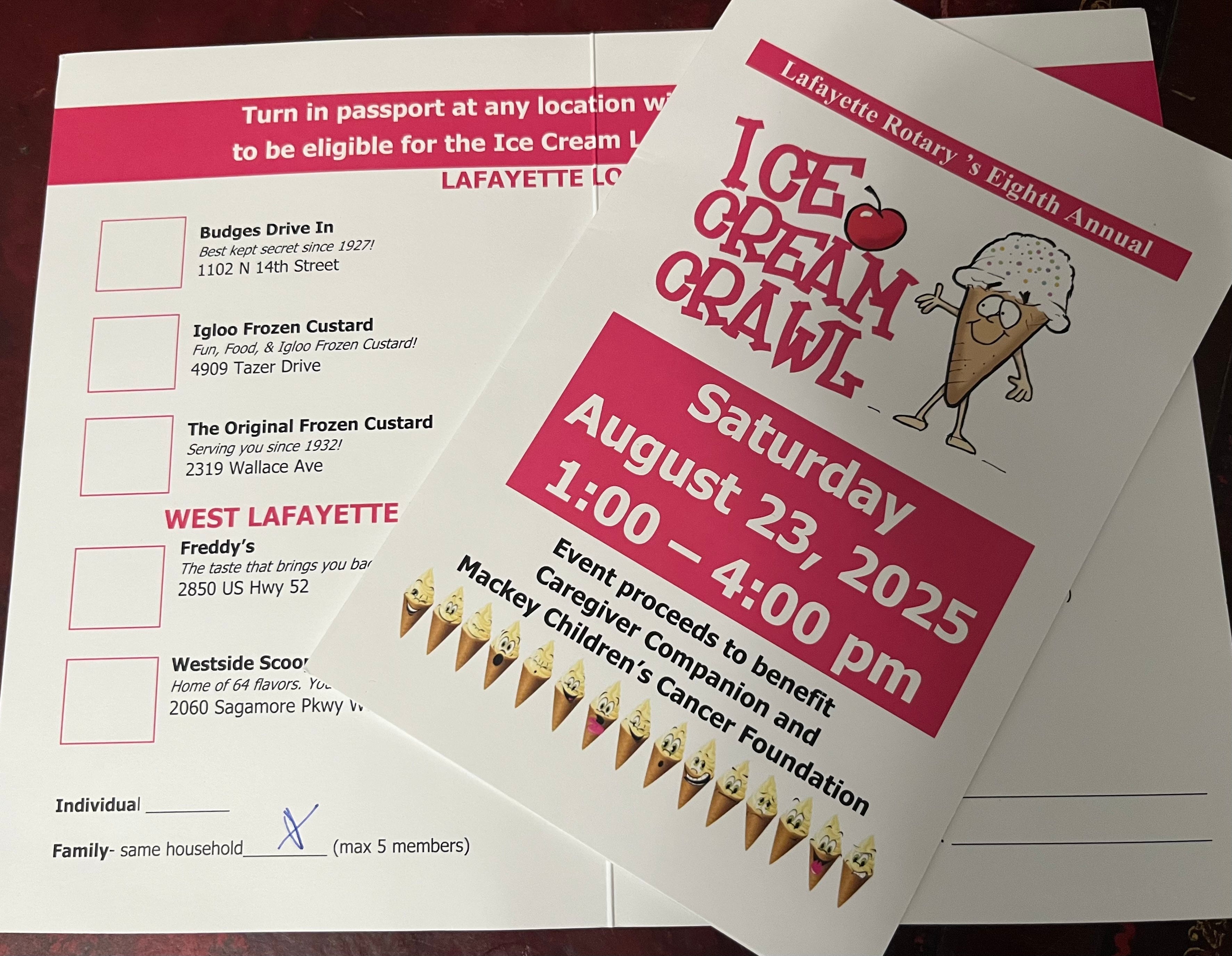 Based in Lafayette has two family passports, good for up to five household members, to give away to full-access subscribers for Lafayette Rotary’s eighth annual Ice Cream Crawl from 1-4 p.m. Saturday, Aug. 23.