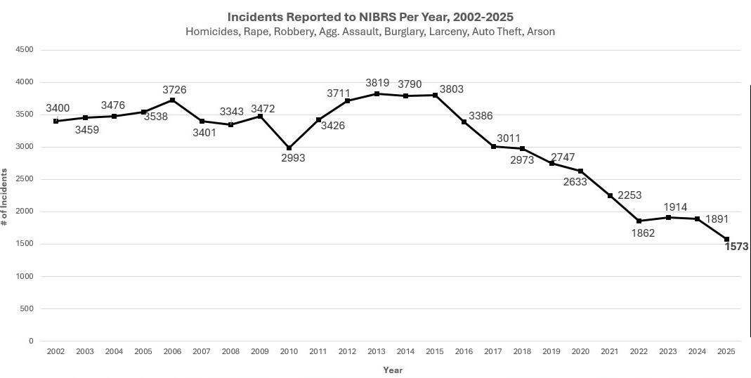 Total number of “Part 1” crimes required to be reported for the NIBRS –violent crimes including homicides, rape, robbery and aggravated assault; and property crimes including burglary, larceny, auto theft and arson – decreased 16.8% in 2025 when compared to 2024, according to LPD numbers. That was a drop from 1,891 in 2024 to 1,573 in 2025.