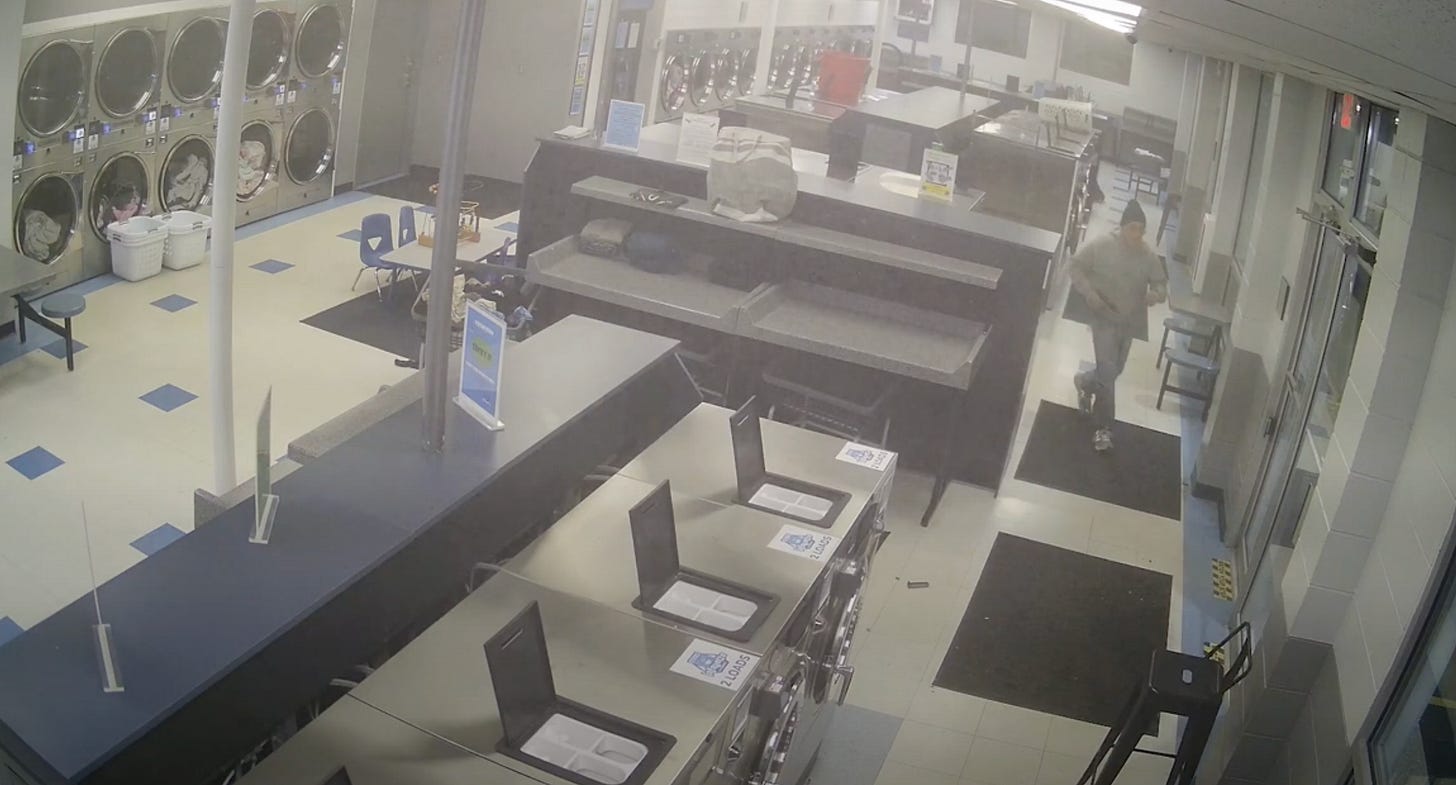 In the surveillance video, McGlothlin, wearing a black stocking cap and a gray hoodie, can be seen stalking around the folding tables in the middle of the laundromat, while appearing to try to fix a malfunction with his gun.