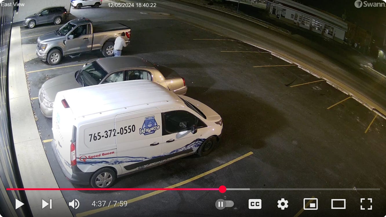 After driving nearly 10 hours straight from his home in Lincoln, Nebraska, on Dec. 5, 2024, Louis McGlothlin spent less than a minute after pulling into the parking lot of the Lafayette Laundry to go inside and indiscriminately shoot three people before returning to his pickup truck, unjamming his handgun and killing himself, according to security video released Thursday by Lafayette police.