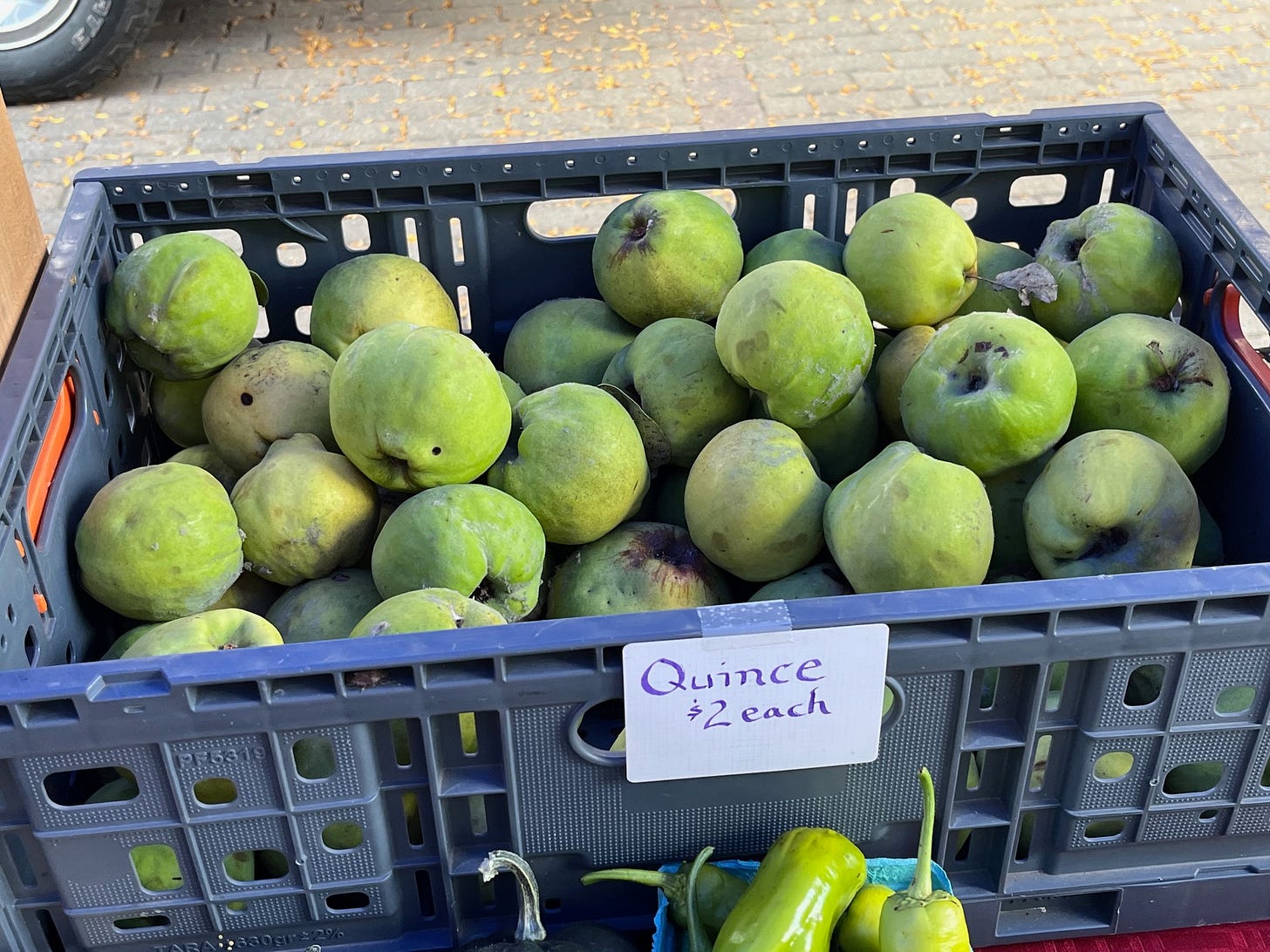 Fairstream Farms had boxes of quince, a fruit I’ve read about but never seen or tasted. This fruit looks like a yellow/green apple that’s seen better days – a bit lumpy but full of character. Daniel Fagerstrom of Fairstream Farms says quince can be eaten raw, but it’s not recommended. They are best cooked, poached or baked. I bought one and sliced off a piece, expecting a taste similar to a pear or apple or a pear/apple combo. Wrong, wrong and wrong. Raw quince are tart and astringent but not unpleasant. I respect the first person who ever tasted this fruit and decided to give it another chance. I baked up the rest of the fruit with a bit of honey, and the taste mellowed considerably. I’m glad I tried this fall fruit and could see adding quince to a fruit pie or crumble.