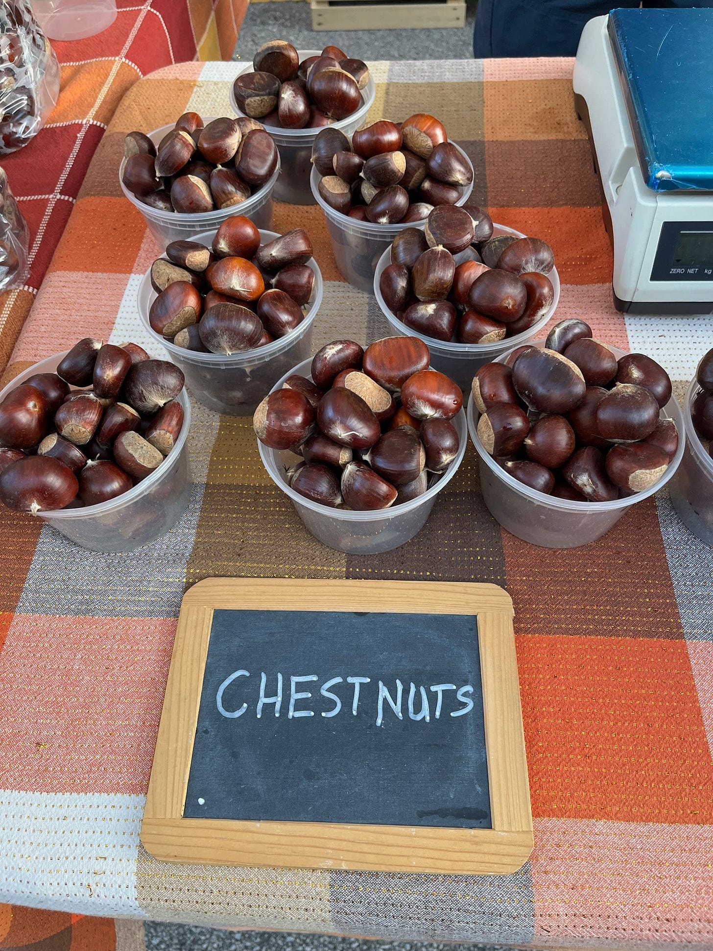 Howard scored and peeled a raw chestnut for me to try and … wow! It had a beautiful, earthy taste and a meaty/starchy texture. I was clueless on how to use them; Howard recommends roasting chestnuts (not on an open fire, but I’m sure you could) in the oven or air fryer. They need to be scored first, but after roasting, the shells come off easily. I bought a box, roasted them and have been eating them as a snack. I think they’d make a crunchy topper for a casserole or in squash and pasta dishes. Chestnuts will be at the market until the end of the season, and I’ll be picking up a few boxes to do some experimenting. If you love nuts, chestnuts are a great addition to your arsenal. They can be stored at room temperature for a few days but do better in the fridge for longer periods. They can also be frozen for up to a year.