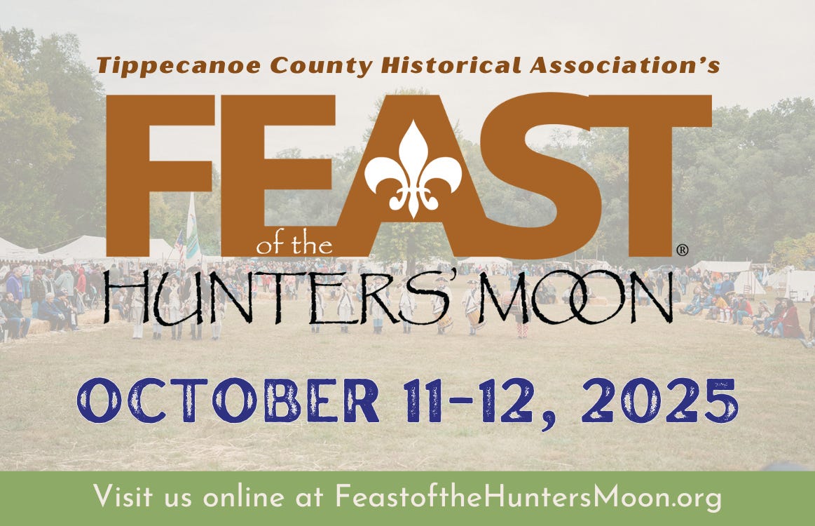 Thanks, again, for support of this edition from the Tippecanoe County Historical Association, presenting the annual Feast of the Hunters’ Moon, Oct. 11-12 at Historic Fort Ouiatenon. Day passes, weekend passes and family passes are on sale now at feastofthehuntersmoon.org.