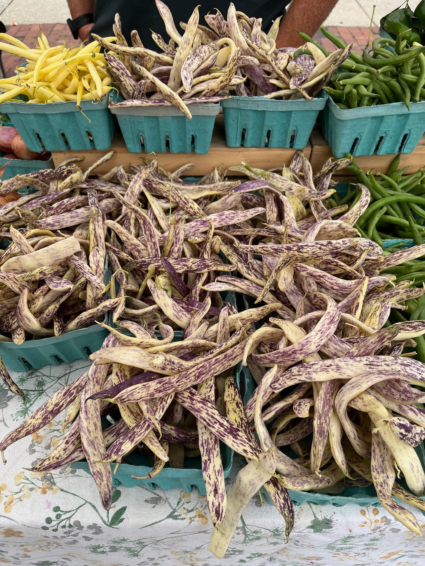 At a few stalls I spotted dragon tongue beans, a variety of yellow wax bean with lovely purple stripes. These curly beans can be prepared as you would other beans, and I tried a batch roasted with olive oil, garlic powder, salt and pepper. They make a terrific side dish but unfortunately lose those pretty purple stripes once heated. Store dragon tongue beans unwashed in a bag in the fridge. They’ll last about a week.