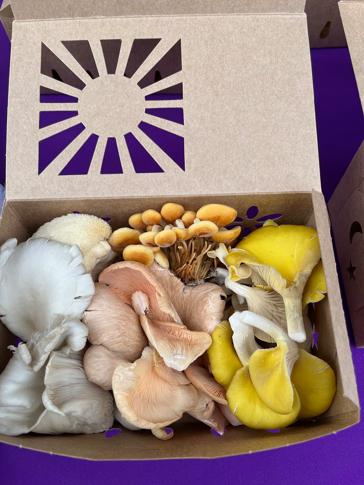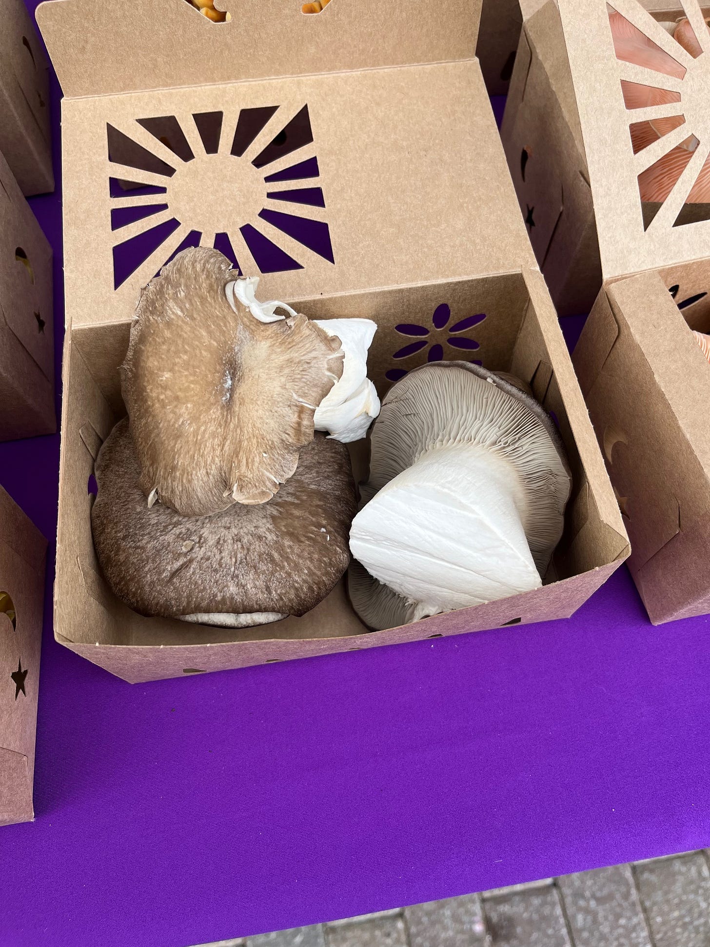 The mushrooms don’t sit alone in the dark. They get 12 hours of sunlight and 12 hours of dark until they’re ready to harvest. What you see in the pretty cardboard boxes are the result of a fine balance of light and dark, temperature and humidity.