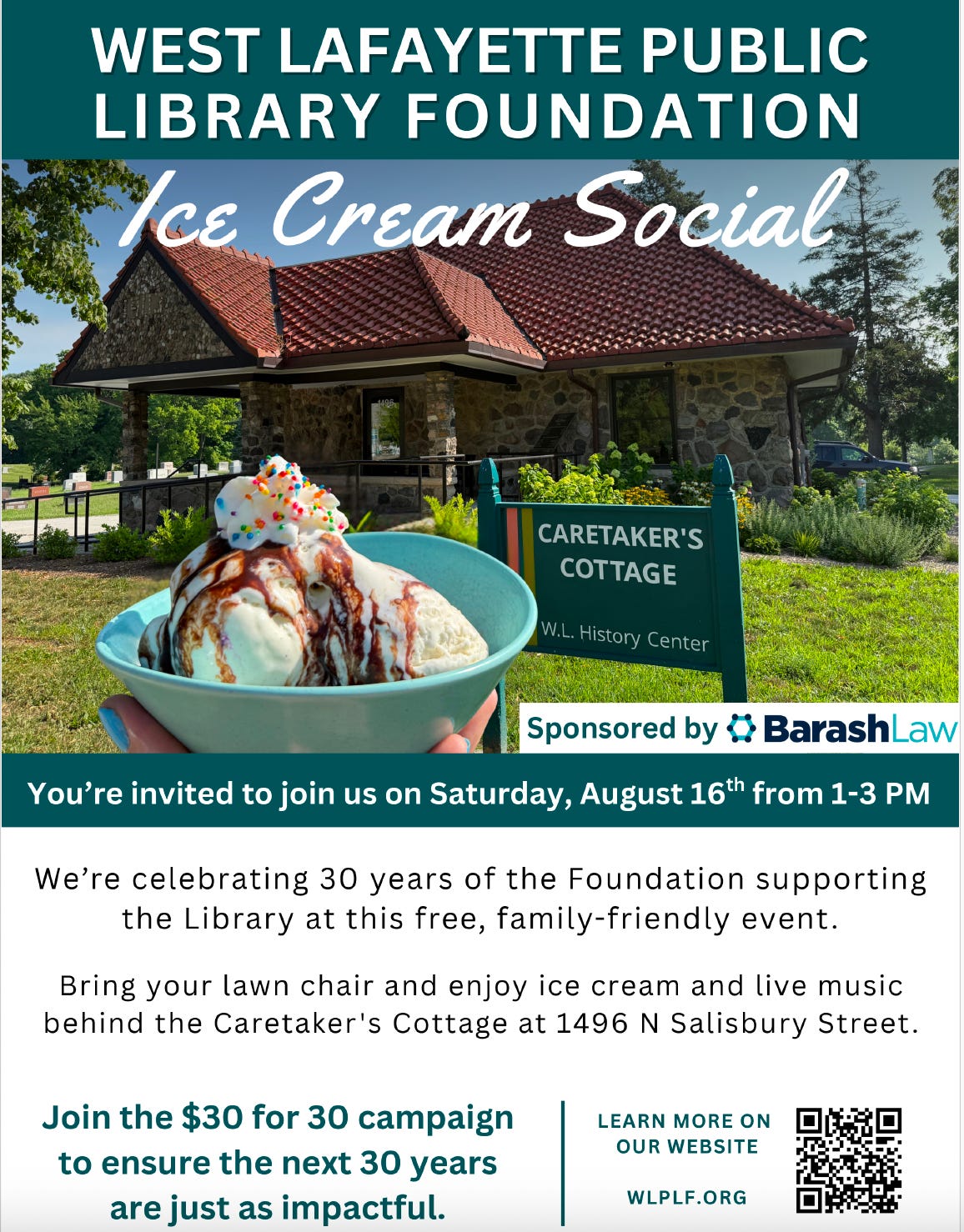 Support for this edition comes from the West Lafayette Public Library Foundation, which will host an ice cream social fundraiser from 1-3 p.m. Saturday, Aug. 16, at the Caretaker’s Cottage, 1496 N. Salisbury St. Donations from the pay-what-you-wish event will support the 1903 cottage next to the Grand View Cemetery, which the library leases from the city as its local history center. The Bum Ditty Barn Dance Band will play on the back porch from 1-2 p.m., followed by the Wabash Valley Youth Symphony string quartet from 2-3 p.m. Learn more here: www.wlplf.org/30years.