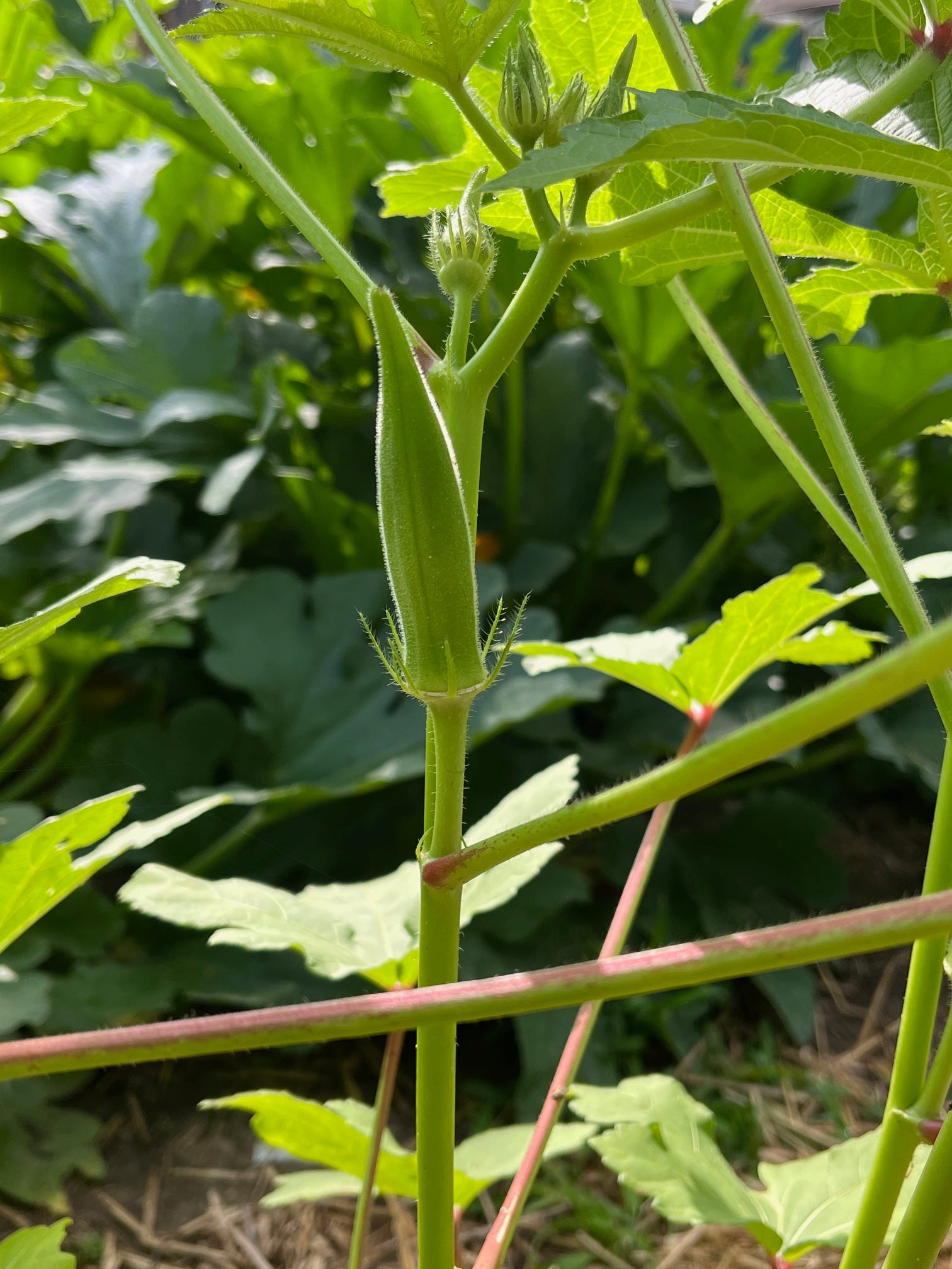 Luckily, I didn’t have to go far for good advice and cooking methods. A few mornings a week I volunteer with GrowLocal, an urban garden network that grows produce to help ease food insecurity and build community here in Lafayette (growlocallafayette.org/), and okra is one of the vegetables grown in the nearly 10 plots – along with cabbage, kohlrabi, rutabaga, tomatoes, peppers, eggplant and squash. Over the last few months, I’ve watched tiny okra starts grow into plants sporting beautiful fan-shaped leaves with a burgundy center, and white/pale yellow flowers that produce bright green pods ready for the picking. Harry Smith, the urban gardener I work with, says okra is best picked at about thumb size, and during a recent work session at one of the gardens, I watched in horror as Smith picked an okra pod from the plant and ATE IT! RAW!