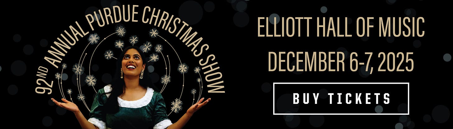 Thanks, again, for support for this edition from Purdue Musical Organizations, presenting the 92nd annual Purdue Christmas Show Saturday and Sunday, Dec. 6-7. Get your tickets here.