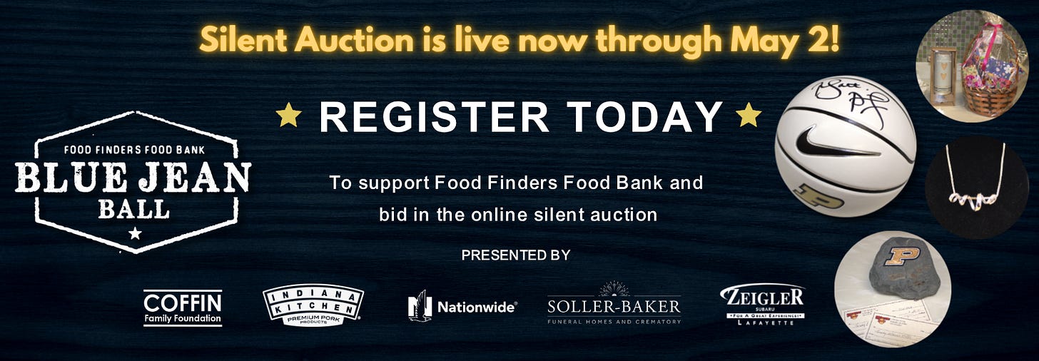 Support for this edition comes from Food Finders Food Bank, presenting the 13th annual Blue Jean Ball Saturday, May 2, at the Beck Agricultural Center in West Lafayette. Since the initial event in 2013, the Blue Jean Ball has raised over $1 million in critical operating funds for the food bank. Proceeds are used to fund Food Finders Fighting Hunger, Giving Hope programs designed to address food insecurity by connecting neighbors to both immediate and long-term resources. Auction items are live now. Get tickets and check the auction by going to foodfinders.wedoauctions.com/
