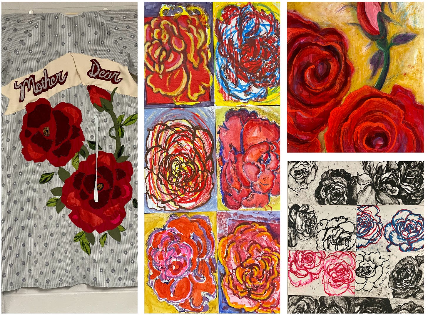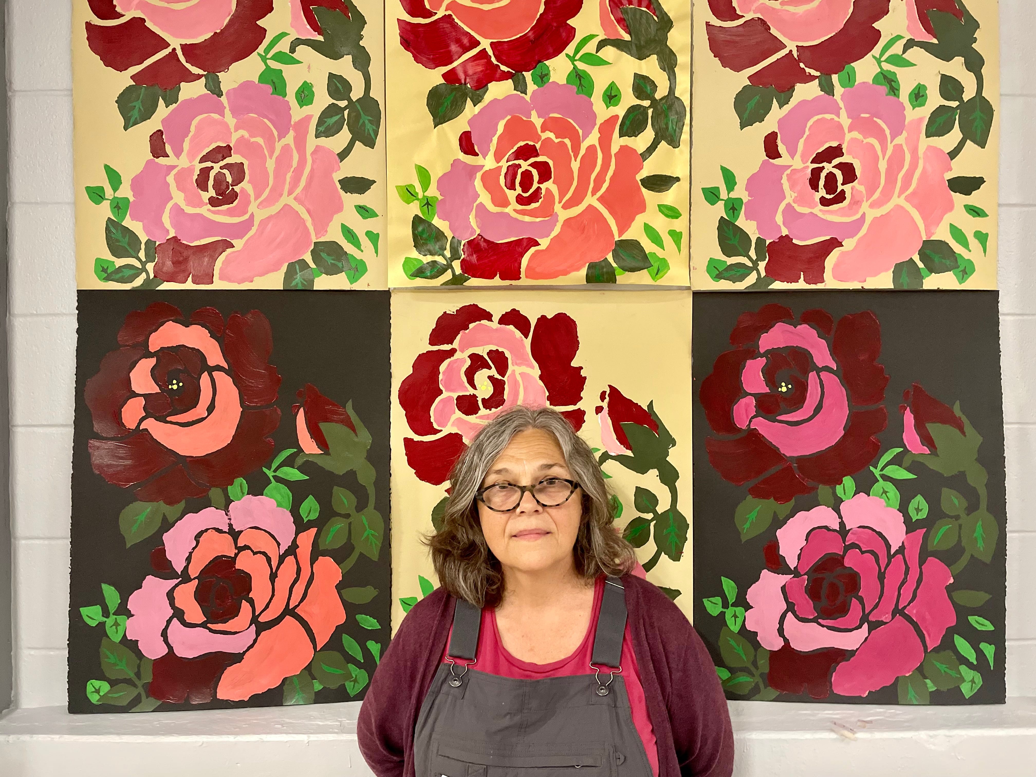 Gallery Walk, 6-9 p.m. Friday, May 17, downtown Lafayette — Put on those walking shoes and art-appreciating glasses because the downtown Gallery Walks are back. Leading the way for this weekend’s edition will be “Roses,” a powerful new show from Lafayette artist Sherri McGlothlin at Bindery Artist Studios, 511 Ferry St. Her first exhibition in 10 years, McGlothin spent more than a year creating about 80 works from various media that depict the same plastic rose plant, one of her late mother’s only possessions when she was moved into assisted living. Sometimes the artist focuses on one blossom; sometimes it’s all three — resting for decades in the same vase. McGlothlin credits her Herron School of Art and Design training for her proclivity to the prolific, and “Roses” fills Bindery’s space with a somber statement of loving remembrance and sadness of loss. McGlothlin has always excelled with the pen and paintbrush, but the artist stretched herself to depict her mother’s roses in media she never worked with before — fabric, monoprints, appliqué, stencil and even yarn. “You don’t find out as much if you’re not making as much,” McGlothlin said. Flanked by two pieces that feature gold leaf, another first for the artist, is the most sobering work in the show: McGlothin sewed roses to the nursing home gown her mother wore during her final days before her Nov. 28, 2022, death. The result is almost a shrine. “I just wanted to do something with it. I was trying to make it beautiful,” she said. Above the flowers on the gown reads “Mother Dear,” an inside joke between the two women inspired by a nerdy neighborhood boy who called his mother unironically by that phrase, as did his many siblings. The phrase became theirs in a joking way, but “Roses” pays tremendous tribute to Kay Beason’s life through her daughter’s first new art in a decade. “The subject is sad, but I think the work is pretty happy, which is what I like,” McGlothlin said. “I think she would feel good and appreciate this work.”