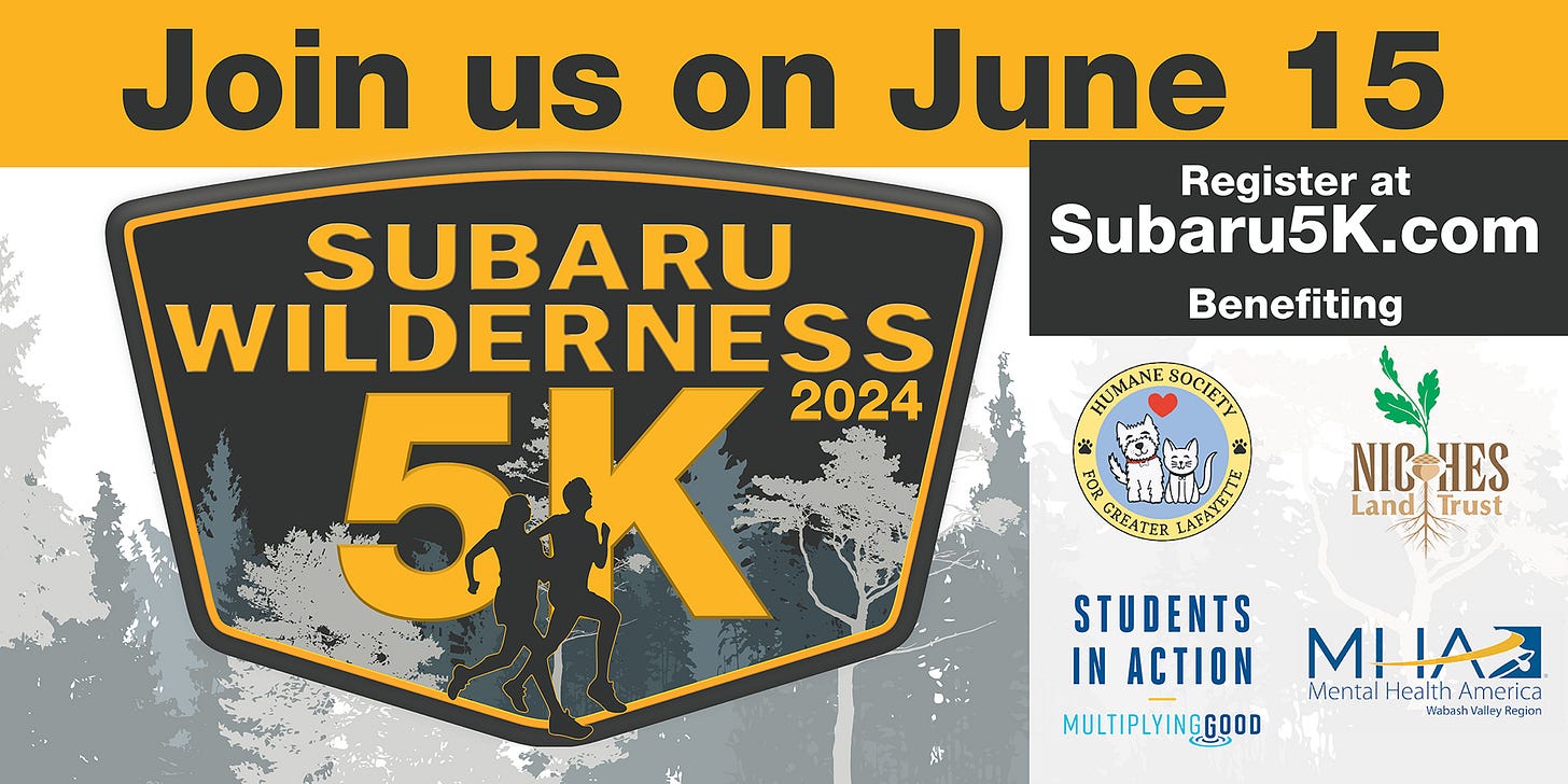 This edition is sponsored by Subaru of Indiana Automotive Inc., presenting the Subaru Wilderness 5K Saturday, June 15, at the SIA Recreation Center Grounds in Lafayette. The event benefits Humane Society for Greater Lafayette, NICHES Land Trust, Multiplying Good / Students in Action and Mental Health America (Wabash Valley Region). To register, click the flyer below.
