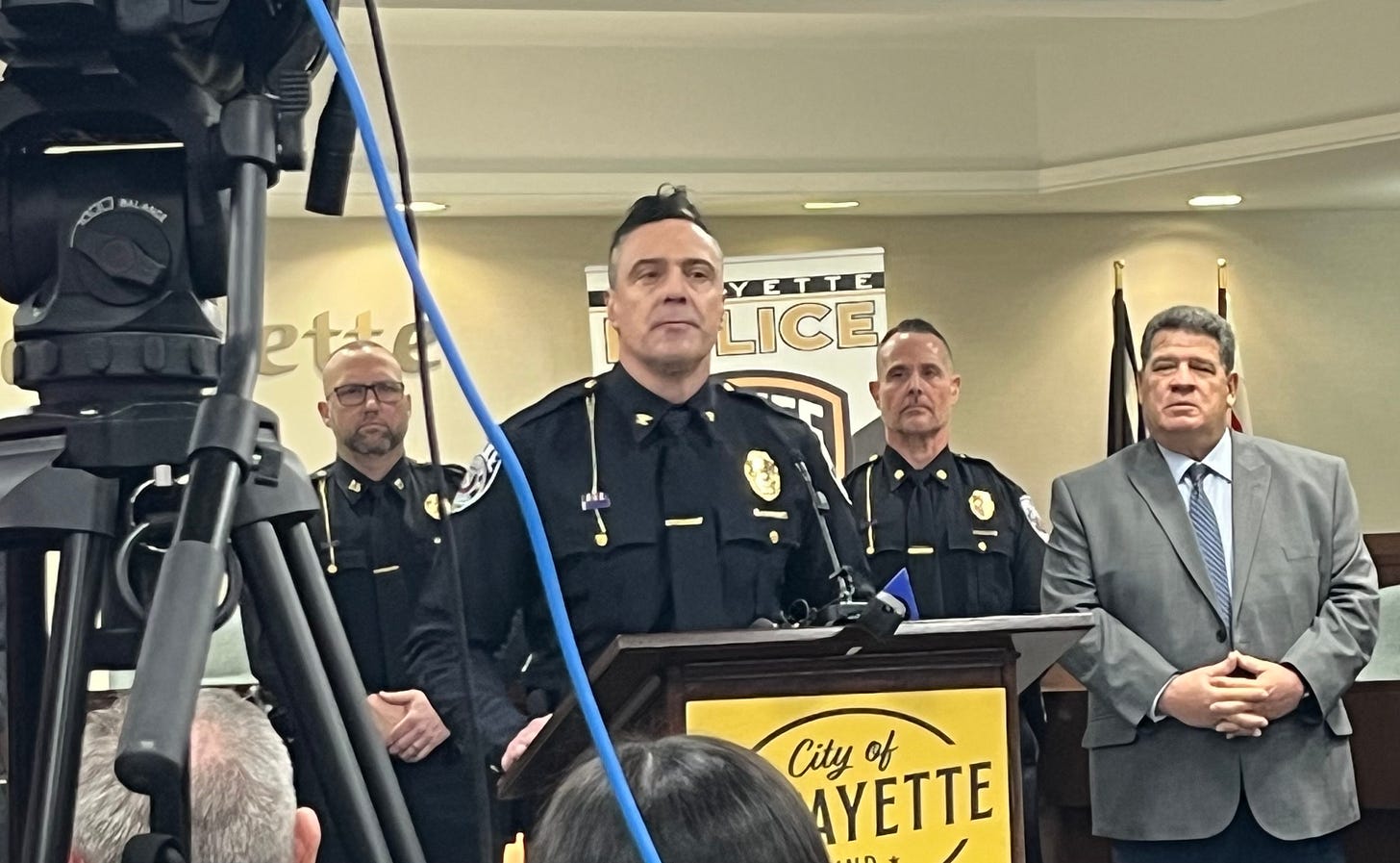 “This was a lion-hearted effort – the investigation didn’t stop,” Galloway, flanked by local, state and federal law enforcement, said during the briefing in city council chambers at Lafayette City Hall.