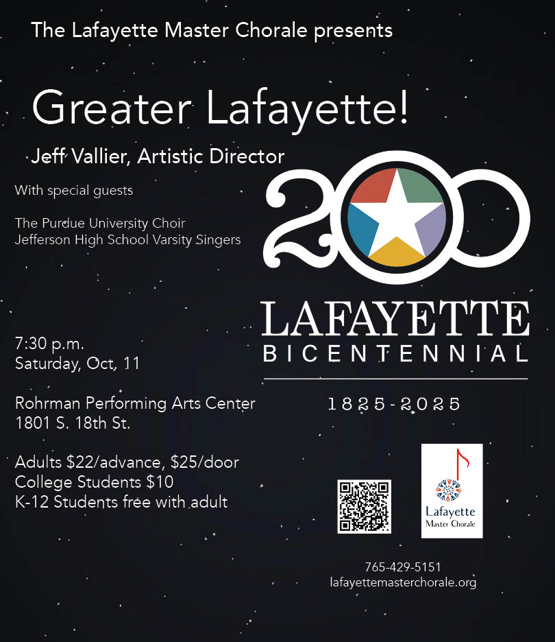 Support for this edition comes from Lafayette Master Chorale, presenting Greater Lafayette! at 7:30 p.m. Saturday, Oct. 11, at the Richard Jaeger Theater, Jefferson High School, 1801 S. 18th St., Lafayette. Season 61 will begin with a rousing tribute to this great city we call home, as the City of Lafayette celebrates its Bicentennial. The Lafayette Master Chorale will be joined onstage by the Jefferson High School Varsity Singers and the Purdue University Choir as they join voices to sing praises to this city on the Wabash. Tickets – adults $22/advance, $25/door; college students, $10; K-12 students, free – at lafayettemasterchorale.org