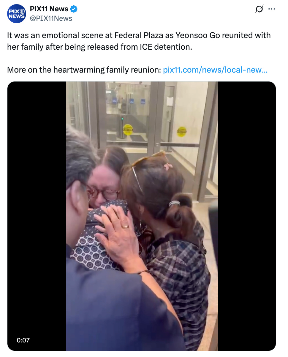 “Everything just feels surreal,” Go said as she was walked out of federal detention with her mother, Rev. Kyrie Kim, according to reporting by Pix11 in New York.