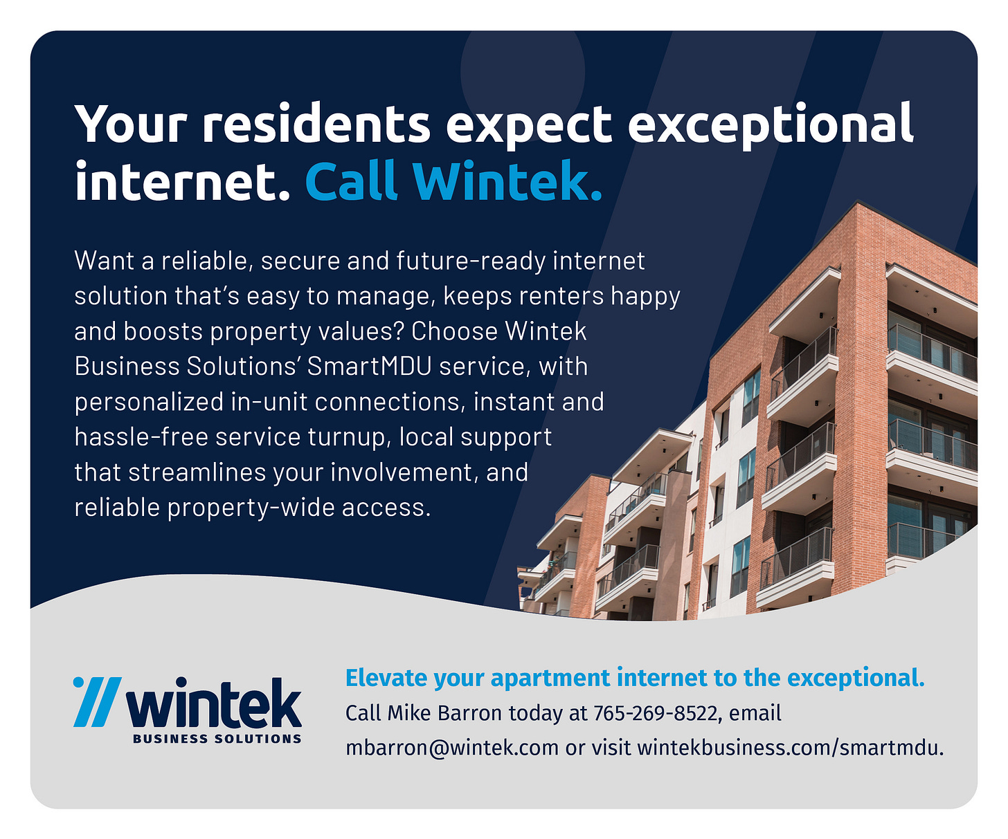 Support for this edition comes from Wintek Business Solutions. Inconsistent internet can rile up your renters. With Wintek Business Solutions’ SmartMDU service, you won’t have to worry about that anymore. SmartMDU offers cost-efficient, renter-friendly fiber internet that’s instantly available, streamlined for easy management with support from our local experts, and reliable property-wide access. Ready to introduce your residents to better internet? Contact Mike Barron today for a free consultation and property assessment. Call 765-269-8522, email mbarron@wintek.com or visit wintekbusiness.com/smartmdu.