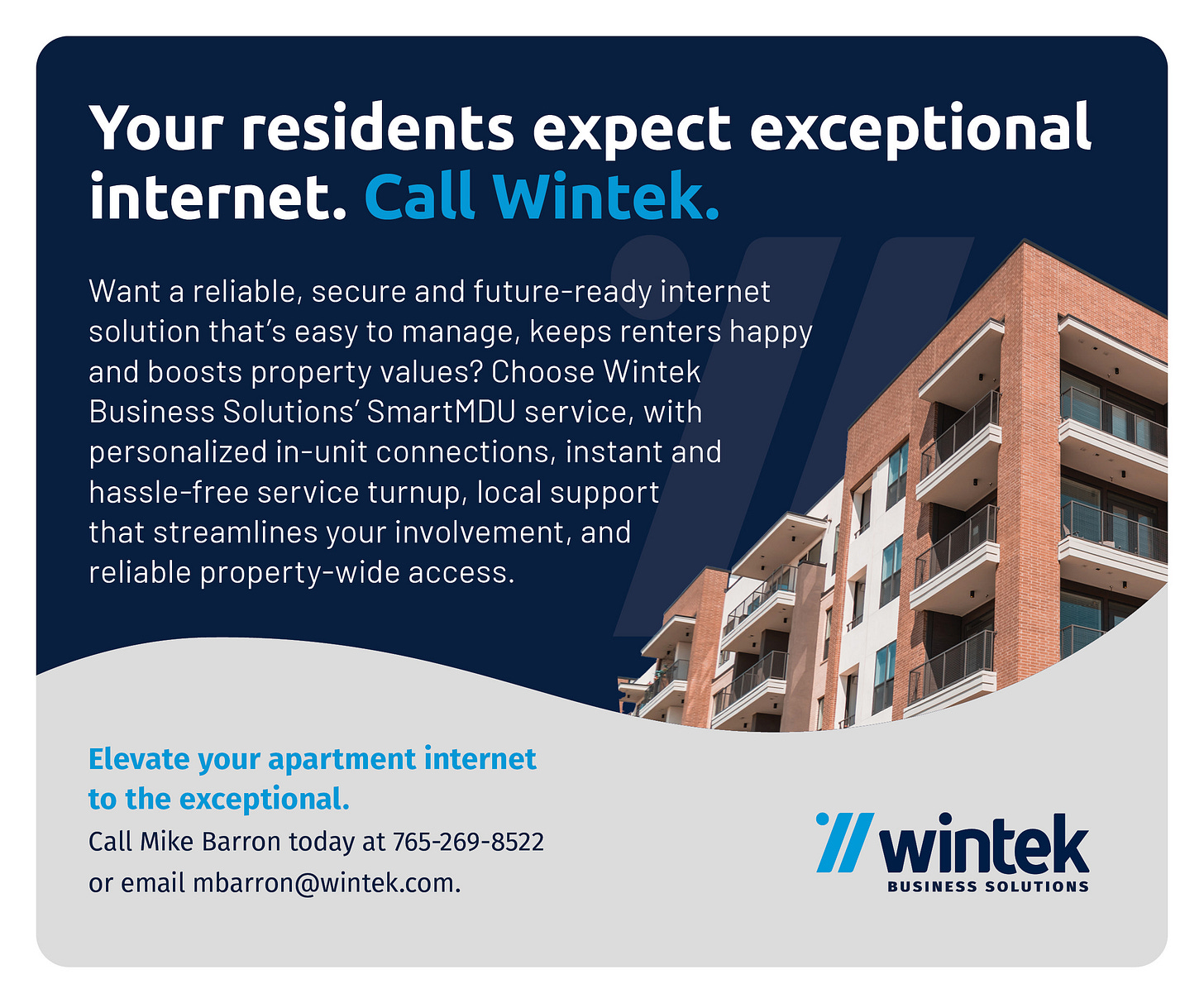 Support for this edition comes from Wintek Business Solutions. Inconsistent internet can rile up your renters. With Wintek Business Solutions’ SmartMDU service, you won’t have to worry about that anymore. SmartMDU offers cost-efficient, renter-friendly fiber internet that’s instantly available, streamlined for easy management with support from our local experts, and set up to provide reliable property-wide access. Ready to introduce your residents to better internet? Contact Mike Barron today for a free consultation and property assessment. Call 765-269-8522 or email mbarron@wintek.com.