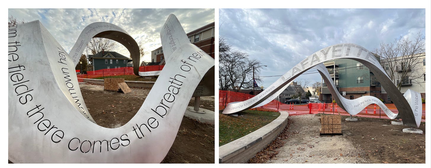 LAFAYETTE BICENTENNIAL SCULPTURE UPDATE: With a new Lafayette Bicentennial sculpture in place at South Ninth and South streets since November, Dennis Carson, the city’s economic development director, said the city is waiting for warmer weather to complete sidewalks and other parts of the installation. Asked by the redevelopment commission for an update Thursday, Carson said he was aiming for completion and a dedication by April.