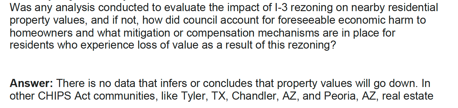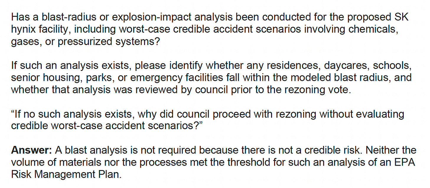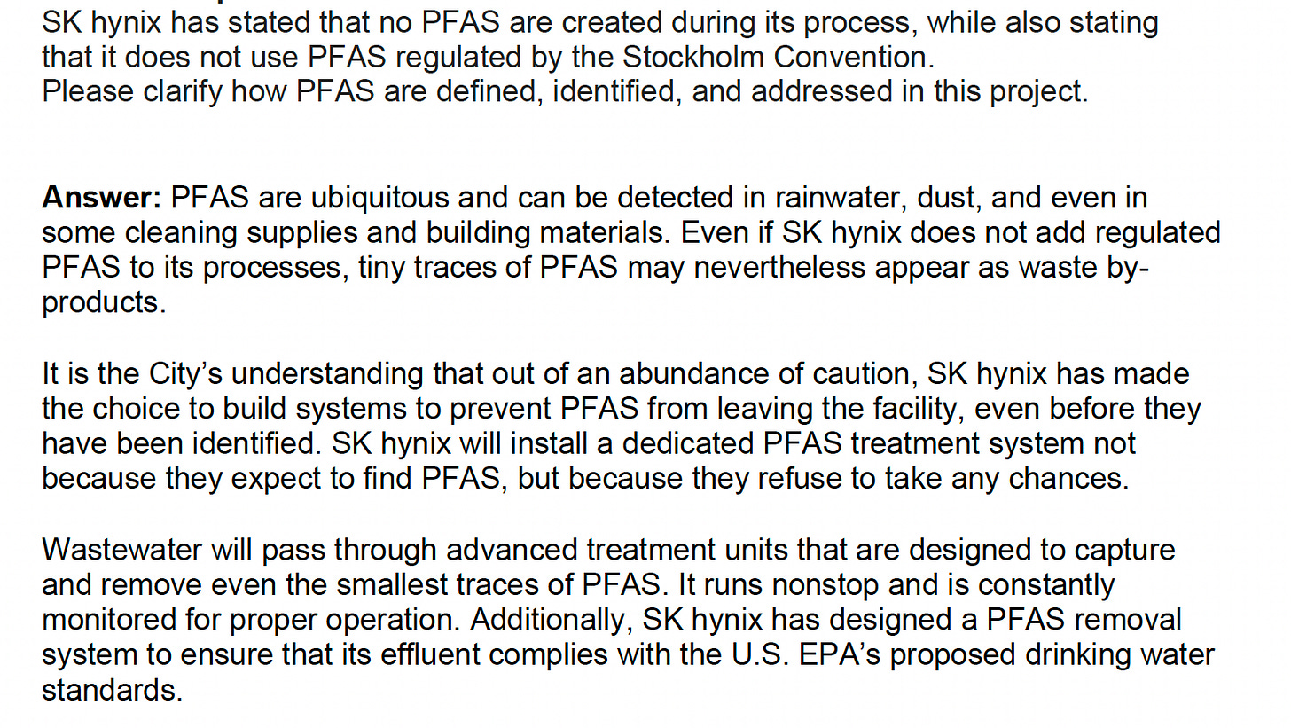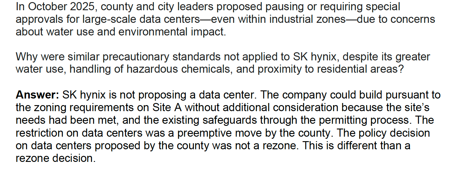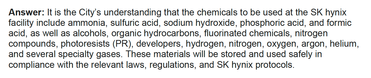 During a Feb. 2 council meeting – the ninth in that string since the SK hynix rezoning – Easter said that after people asked to have their questions in recent months about permitting, the zoning process, health and environmental concerns and more answered on the record and in writing, she had been working to address those, aiming for a Feb. 18 deadline.