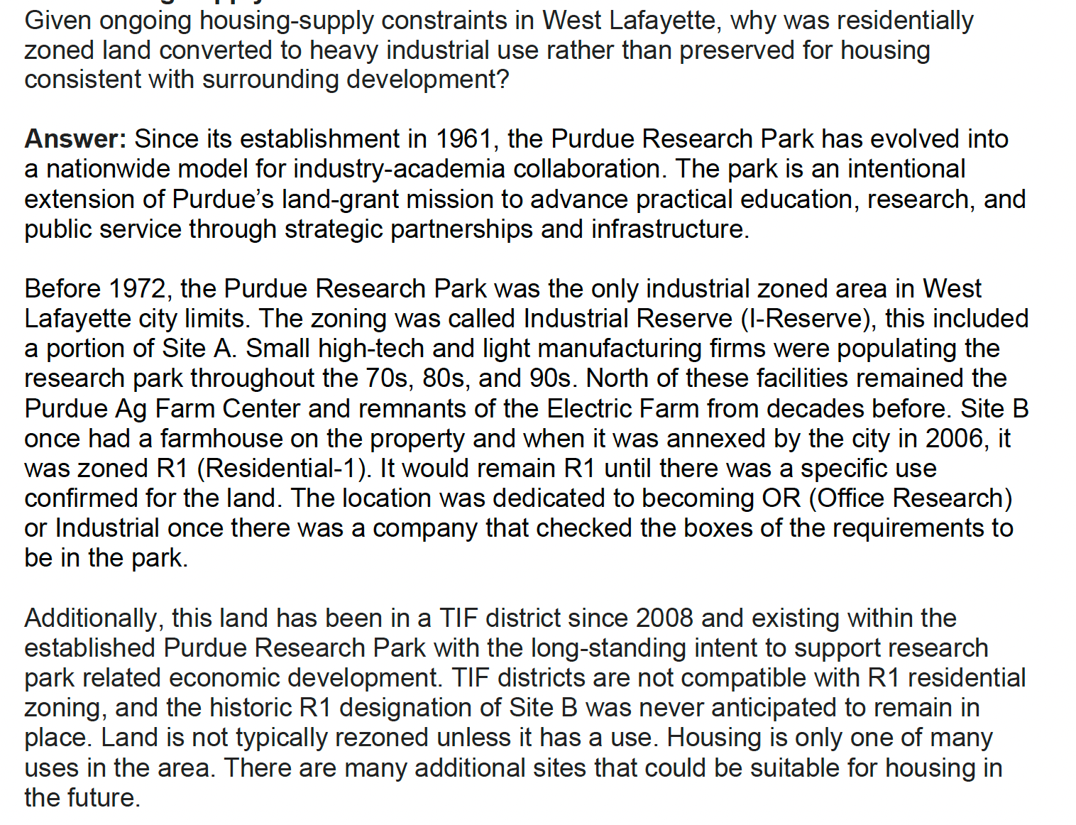 (Context: SK hynix initially was slated to build on a 90-acre site zoned for heavy industry on the west side of Yeager Road. The company later pursued Purdue Research Foundation-owned, residentially zoned land on the east side of Yeager Road, tabbing it as Site B. Site B is where SK hynix is building.)