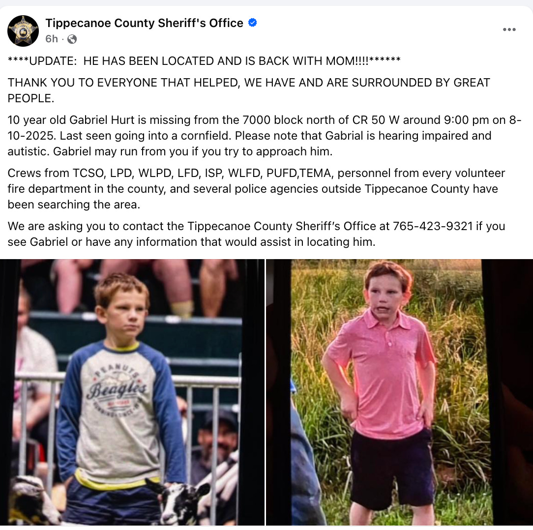 OVERNIGHT SEARCH FOR 10-YEAR-OLD FINDS BOY WHO WANDERED INTO CORNFIELD: Social media posts late Sunday and early Monday were saturated with word about the search for Gabriel Hurt, a 10-year-old last seen Sunday evening walking into a cornfield near County Road 50 West, about a mile north of Harrison High School. Good news, though: After personnel from police and emergency management departments from Tippecanoe and surrounding counties search by air, with dogs and on foot, the sheriff’s office reported he’d been found around 9 a.m. Monday. J&C reporter Ron Wilkins had more details here: “Missing 10-year-old found safe 12 hours after he wandered into a cornfield.”