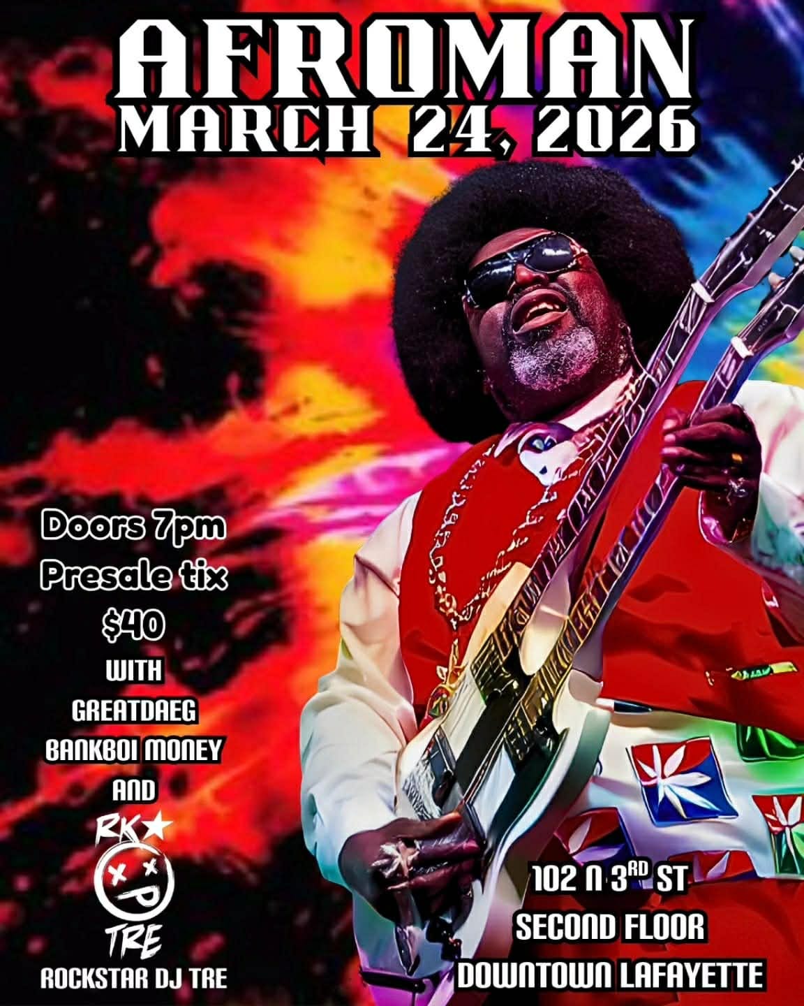 Thanks, again, for support for this edition from Rat Pak Venue in downtown Lafayette, presenting Afroman at 9 p.m. Tuesday, March 24. Get tickets here. Discount code: thanks.