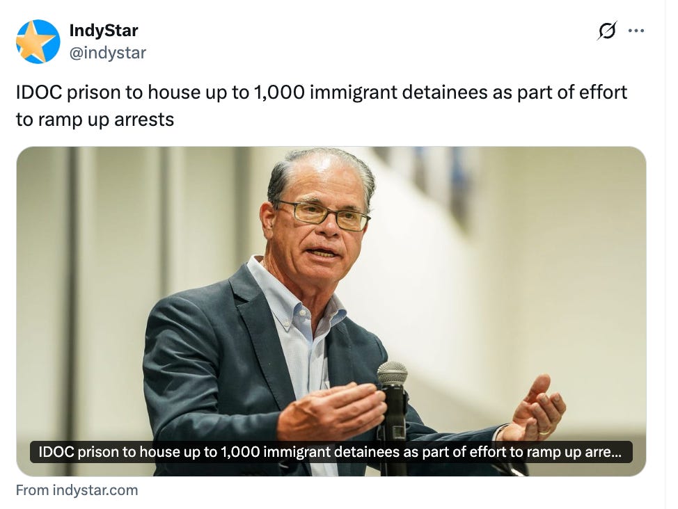 GOVERNOR PUTS STATE PRISON SPACE, ISP SUPPORT FOR FEDERAL IMMIGRATION CRACKDOWN: Gov. Mike Braun went all in Friday on his administration’s support for federal immigration enforcement, offering 1,000 beds at the Miami Correctional Facility and promising state support, including Indiana State Police troopers, to arrest and detain people for immigration violations. Indianapolis Star reporters Kristine Phillips and Alexandra Burris had more details here: “Indiana Department of Corrections prison to house up to 1,000 immigrant detainees as part of effort to ramp up arrests.”
