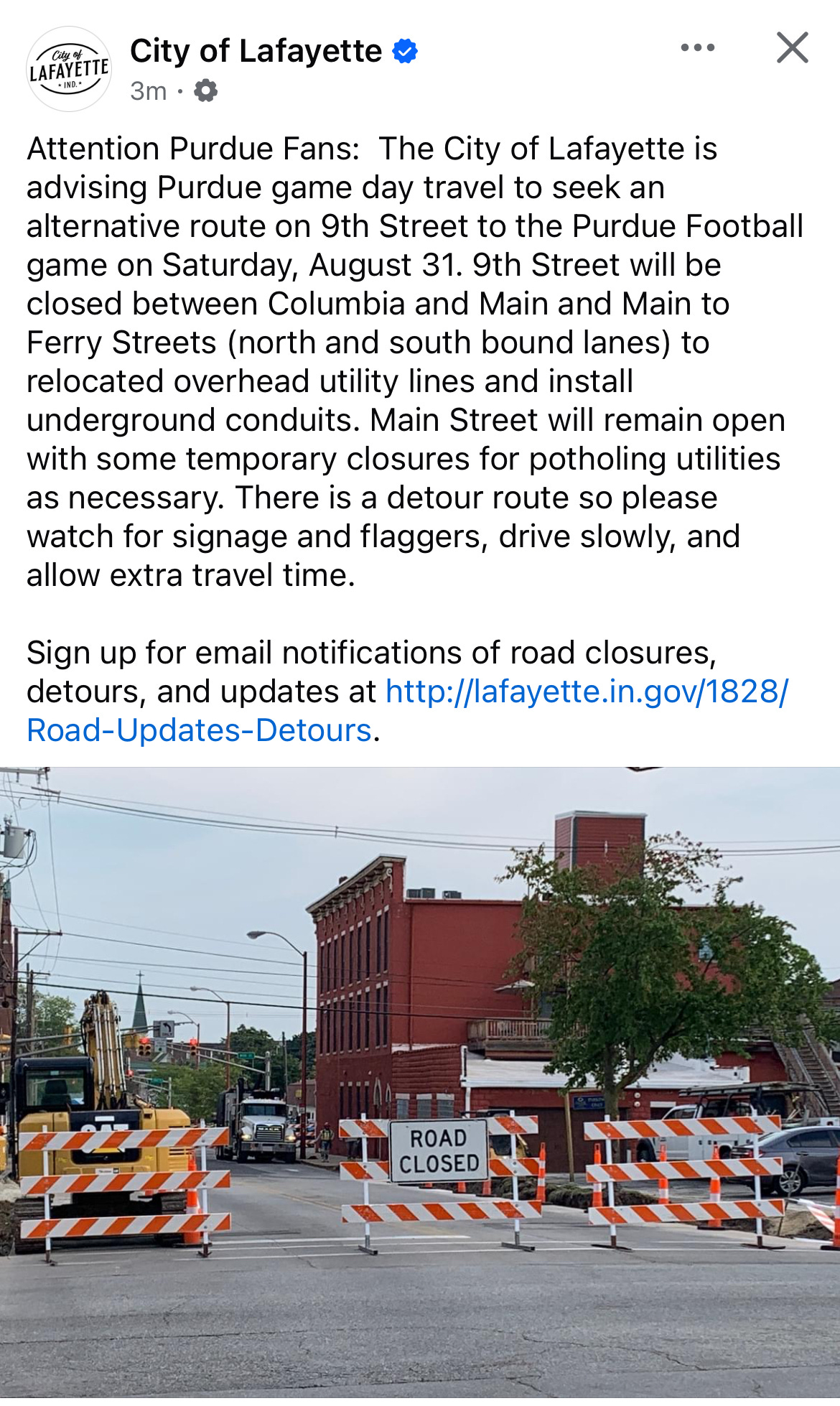 GAME DAY DETOUR: Heads up on North Ninth Street through downtown Lafayette on this opening day of the Purdue football season – not to mention the final Mosey Down Main Street of 2024 – for this detour note from the city: