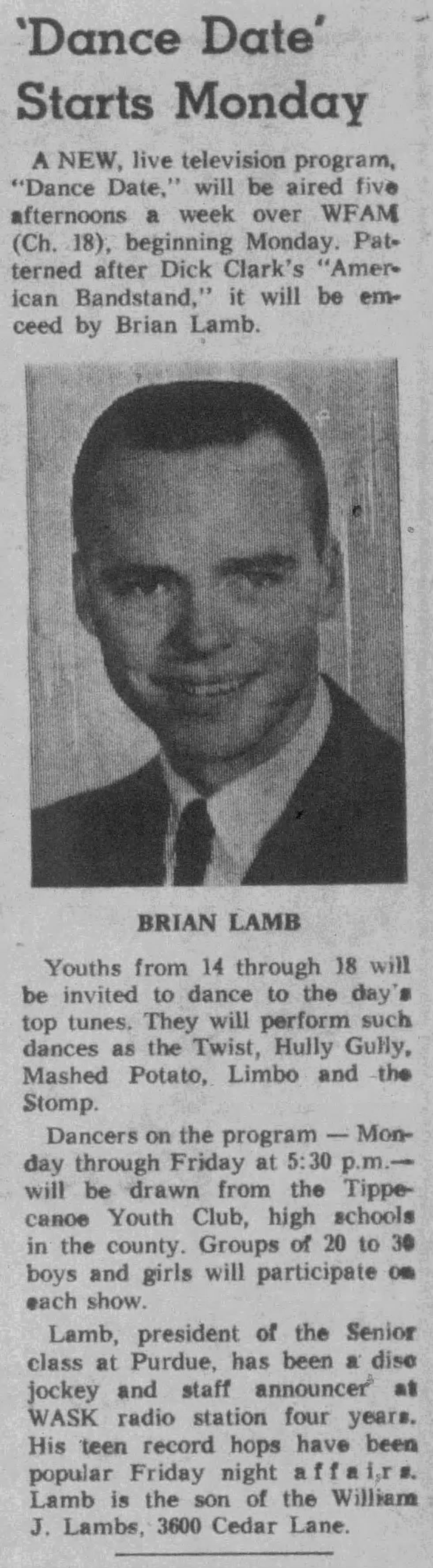 If Friday meant retirement, here’s a look back to something closer to the start, when Lamb turned the teen record hops of Friday night into programming on the fledgling TV station in town. Here’s write-up in the Sept. 15, 1962, Journal & Courier announcing the debut of “Dance Date” on WFAM, the precursor to WLFI. Lamb, listed as senior class president at Purdue and already a four-year veteran at WASK radio, was lined up for the show modeled off “American Bandstand” and featuring teens from high schools and the Tippecanoe Youth Club who’d “perform such dances at the Twist, Hully Gully, Mashed Potato, Limbo and the Stomp.”
