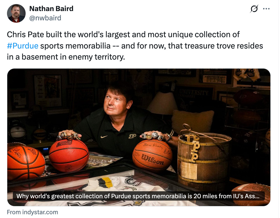 SPEAKING OF PURDUE SPORTS …: This story from Indianapolis Star reporter Nathan Baird, on the Boilermaker memorabilia collected by Chris Pate, is worth it just to check out the Top 10 list of the pieces on the Purdue grad’s shelves and walls. Read it here: “Why world's greatest collection of Purdue sports memorabilia is 20 miles from IU's Assembly Hall.”