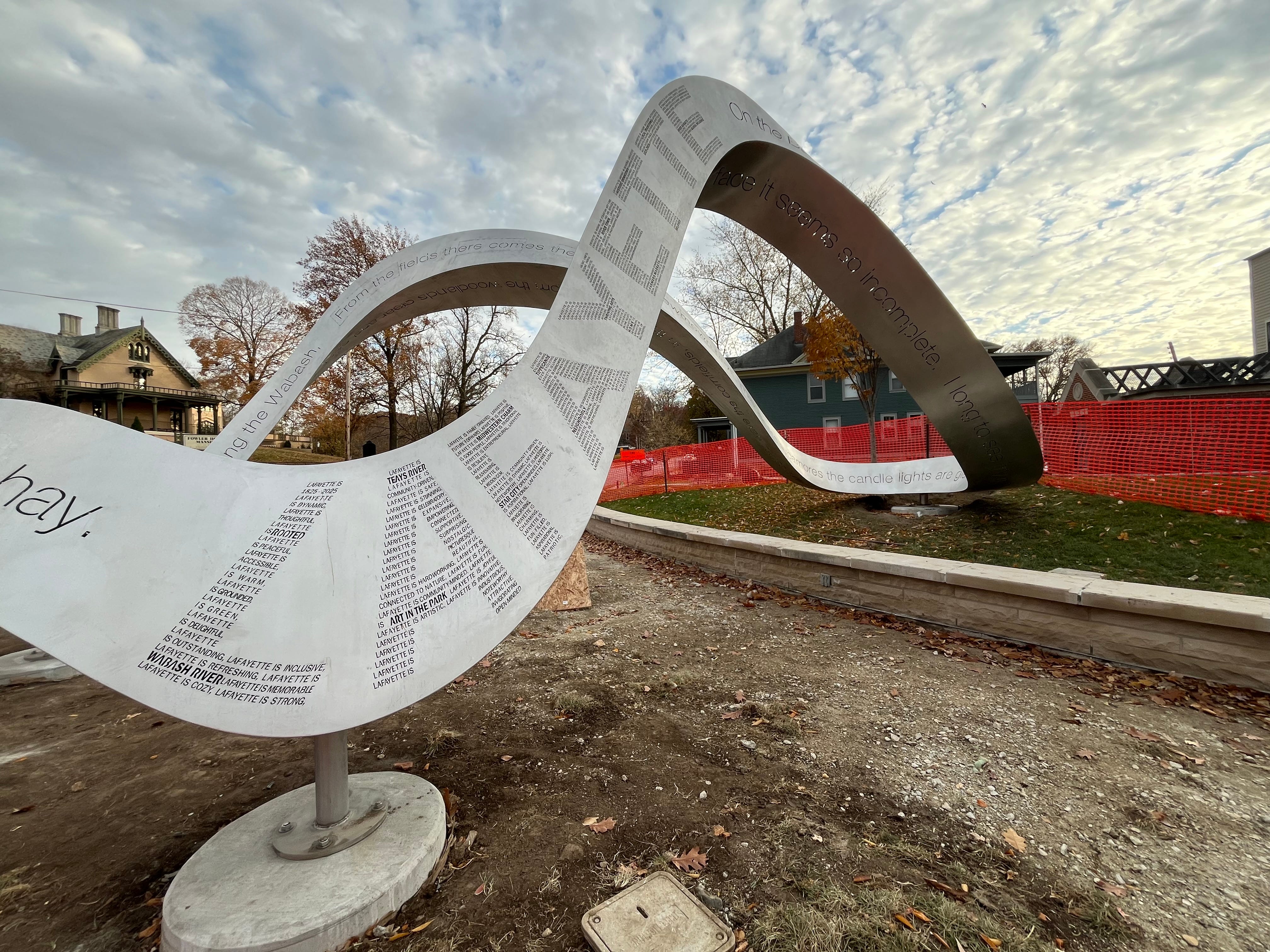 The piece – which includes the city’s name and lyrics from “On the Banks of the Wabash, Far Away” by Indiana native Paul Dresser etched in the metal – was still surrounded by fencing, pending work needed to replace the sidewalk ripped out for the project.