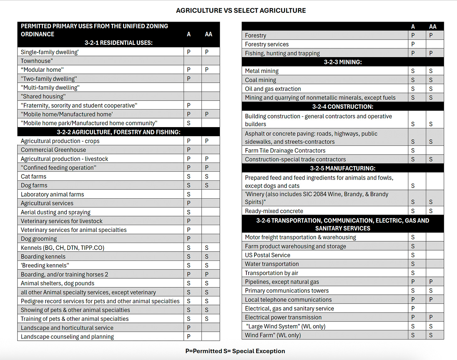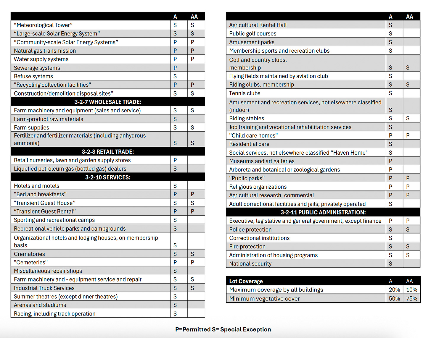 Uses, A vs. AA zoning: Here’s a look at the housing and commercial uses that would be allowed, along with which ones would require a special exception in the AA/select agricultural zoning designation, compared to the current A/agricultural zoning: