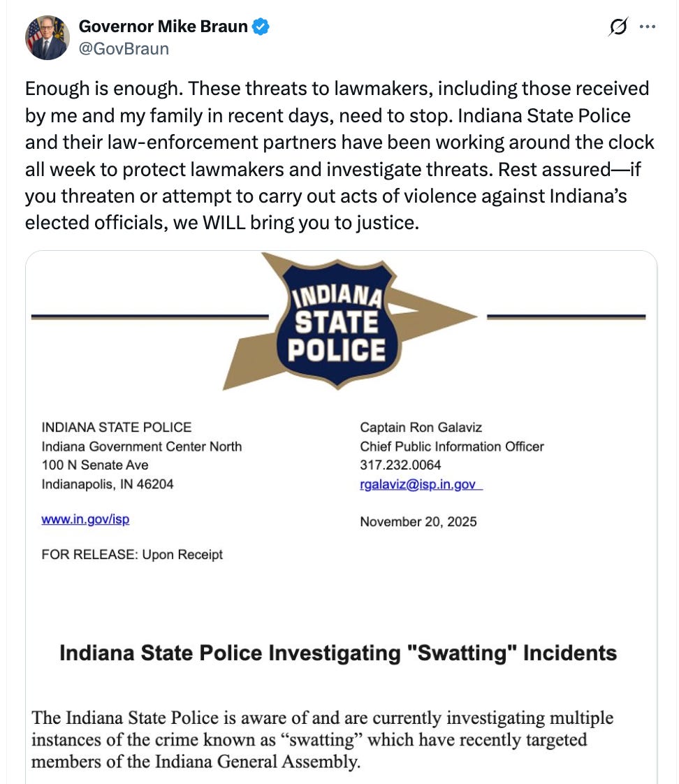 THREATS, SWATTING CONTINUE IN THE SHADOW OF REDISTRICTING DEBATE: Gov. Mike Braun said Friday that he was among a growing list of lawmakers and Statehouse officials who have been targeted by swatting attempts and other threats as the political rhetoric ramps up over demands to redraw Indiana’s congressional district maps. As of Friday, at least seven Republican lawmakers had received threats or been victims of swatting incidents in the past week.