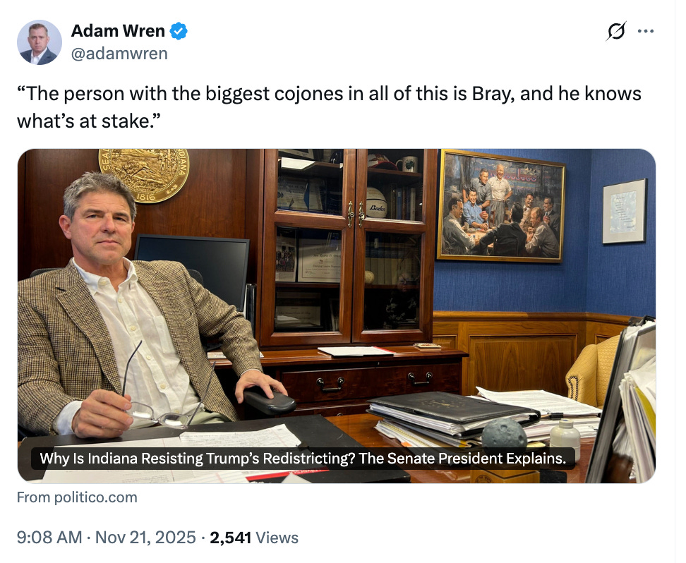 Reporter Adam Wren, writing for Politico, had this conversation with Sen. Rodric Bray, the Indiana Senate leader who has been taking much of the heat from Braun, Trump and other pro-redistricting forces after saying a week ago he wouldn’t call the Senate into session because the votes weren’t there: “Why Is Indiana Resisting Trump’s Redistricting? The Senate President Explains. Rodric Bray is doing what he thinks is right, even when the president calls him a ‘RINO.’”
